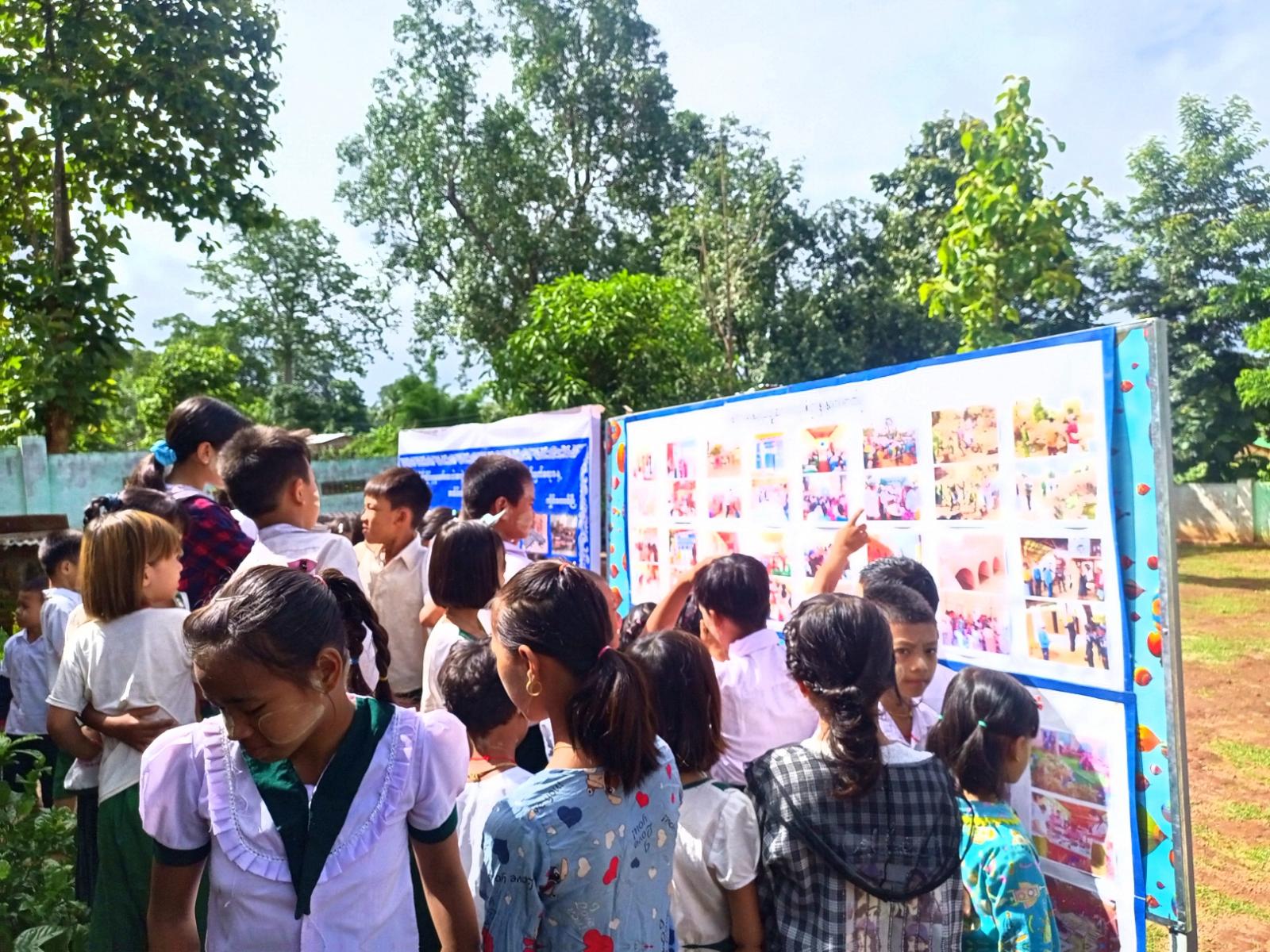 ထို့နောက် အခြေခံပညာမူလတန်း(တာကွန်)ကျောင်းမှ ကျောင်းသား၊ ကျောင်းသူများနှင့် ဆရာ/ဆရာမများက ပြန်ကြားရေးနှင့်ပြည်သူ့ဆက်ဆံရေးဦးစီးဌာနမှ ပြသထားသည့် အသိပညာပေး နံရံကပ်စာစောင်များ၊ နံရံကပ်ဓာတ်ပုံများကို စိတ်ဝင်စားစွာ ကြည့်ရှုလေ့လာခဲ့ကြကြောင်း သိရသည်။
