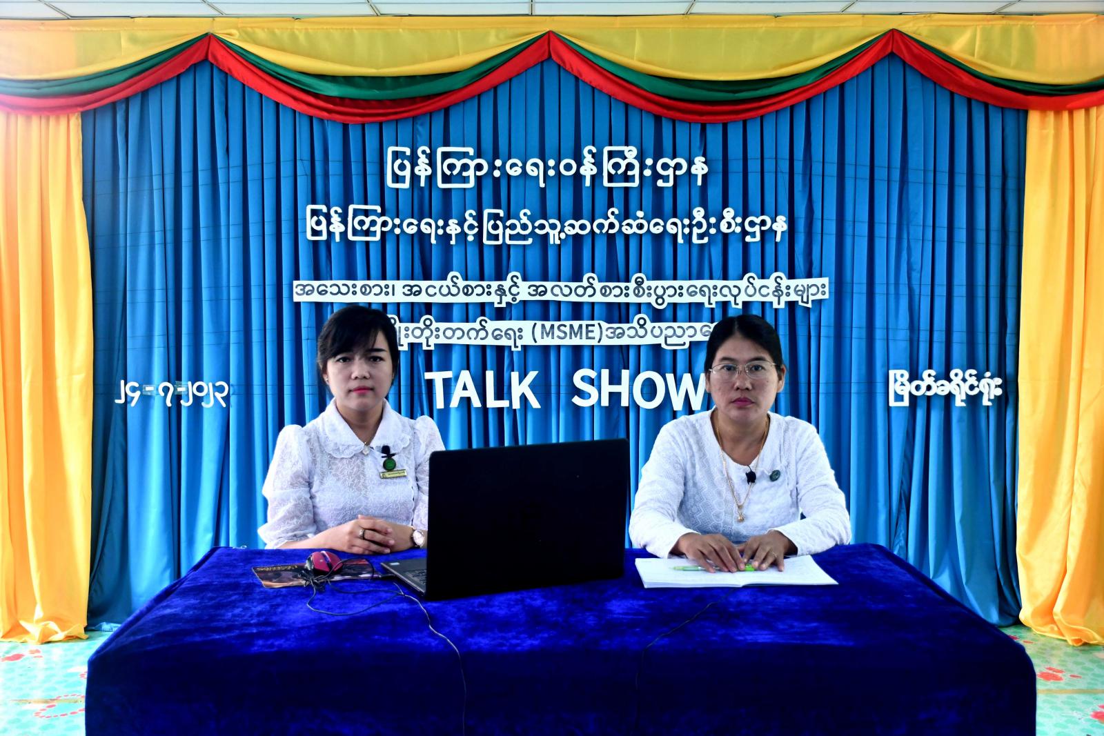 Talk Show အစီအစဉ်ကို ပြန်ကြားရေးနှင့်ပြည်သူ့ဆက်ဆံရေးဦးစီးဌာန လက်ထောက်ညွှန်ကြားရေးမှူး ဒေါ်မေသန္တာအောင်နှင့် အသေးစား စက်မှုလက်မှုလုပ်ငန်းဦးစီးဌာန ခရိုင်ဦးစီးမှူး ဒေါ်သူသူစံတို့က အသေးစား၊ အငယ်စားနှင့် အလတ်စားလုပ်ငန်းရှင်များ ပေါ်ထွက်လာစေရန် ဆောင်ရွက်ပေးနေသည့်လုပ်ငန်းများ၊ ပြည်သူ့အကျိုးပြုလုပ်ငန်းများ၊ မှတ်ပုံတင်ဆောင်ရွက်ရမည့် လုပ်ငန်းအမျိုးအစားများနှင့် သတ်မှတ်ချက်များအတိုင်းဆောင်ရွက်ပြီး စားသောက်ကုန်၊ လူသုံးကုန်နှင့် အလှကုန်ပစ္စည်းများကို ဘေးအန္တရယ်ကင်းရှင်းအောင် ဓာတ်ခွဲစမ်းသပ်ဆောင်ရွက်ပေးခြင်း အကြောင်းအရာများကို ကျယ်ကျယ်ပြန့်ပြန့် ဆွေးနွေးခဲ့ကြသည်။