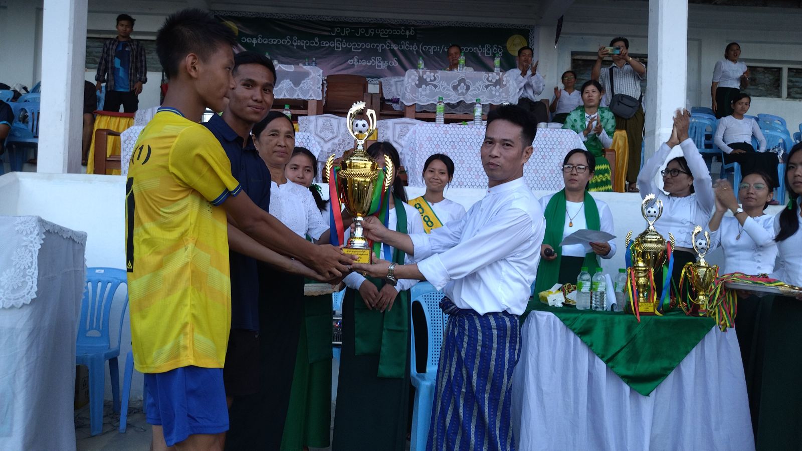 ဆက်လက်၍ အဆိုပါဘောလုံးပြိုင်ပွဲဆုပေးပွဲကျင်းပရာ ခရိုင်ပညာရေးမှူးရုံးမှ လက်ထောက် ညွှန်ကြားရေးမှူး ဦးလဆန်က အမှာစကားပြောကြားခြင်း၊ ခရိုင်ပြန်ကြားရေးနှင့်ပြည်သူ့ဆက်ဆံရေး ဦးစီးဌာနမှ ခရိုင်ဦးစီးမှူး ဦးအောင်ကျော်ထွန်းက (ကျား)ဘောလုံးပြိုင်ပွဲတွင် ပထမဆုရရှိသည့် အ.ထ.က(၁)(ကျား)အသင်းအား ဆုများချီးမြှင့်ပေးအပ်ခြင်း၊ ဦးနိုင်ဌေး (သစ်လွင်ဆုတံဆိပ်လုပ်ငန်းရှင်)က (ကျား)ဘောလုံးပြိုင်ပွဲတွင် ဒုတိယဆုရရှိသည့် အ.ထ.က(၄) ကျားအသင်းအား ဆုများချီးမြှင့် ပေးအပ်ခြင်း၊ မြို့နယ်အားကစားကာယပညာဦးစီးဌာနမှ မြို့နယ်အားကစားမှူးဦးသက်ပိုင်က (ကျား)ဘောလုံးပြိုင်ပွဲတွင် တတိယဆုရရှိသည့် အ.ထ.က(၆) (ကျား)အသင်းအား ဆုများချီးမြှင့်ခြင်း၊ ခရိုင်အားကစားကာယပညာဦးစီးဌာနမှ ခရိုင်ဦးစီးမှူး ဦးကြည်စိုးက (မ)ဘောလုံးပြိုင်ပွဲတွင် ပထမဆုရရှိသည့် အ.ထ.က(၂) (မ)အသင်းအား ဆုများ ချီးမြှင့်ပေးအပ်ခြင်း၊ ဒုမြို့နယ်ပညာရေးမှူး ဦးဝင်းတင့်က (မ) ဘောလုံးပြိုင်ပွဲတွင် ဒုတိယဆုရရှိသည့် အ.ထ.က(သိန်လင်) (မ)အသင်းအား ဆုများပေးအပ် ချီးမြှင့်ခြင်း မြို့နယ်ပညာရေးမှူး ဒေါ်ထုလွမ်က (မ)ဘောလုံးပြိုင်ပွဲတွင် တတိယဆုရရှိသည့် အ.ထ.က(၃) (မ)အသင်းအား ဆုများပေးအပ်ချီးမြှင့်ခြင်း၊ ဘောလုံးပြိုင်ပွဲ ပွဲစဉ်တစ်လျှောက် နေရာအလိုက် အကောင်းဆုံးအားကစားသမားဆု ရရှိသူများကို ခရိုင်ပညာရေးမှူးရုံးမှ လက်ထောက်ညွှန်ကြားရေးမှူး ဦးလဆန်က ဆုများချီးမြှင့်ပေးအပ်ခဲ့ကြပြီး မြို့နယ်ပညာရေးမှူးဒေါ်ထုလွမ်က ဆီမီးဖိုင်နယ်နှင့် ဗိုလ်လုပွဲတို့တွင် ပါဝင်ကူညီပေးခဲ့သည့် ဒိုင်၊ လိုင်းနတ်များကိုလည်း ဂုဏ်ပြုလက်ဆောင်များ အသီးသီးပေးအပ်ချီးမြှင့်ခဲ့ကြောင်း သိရသည်။
