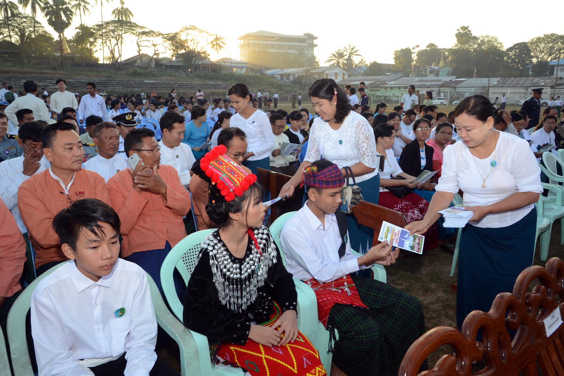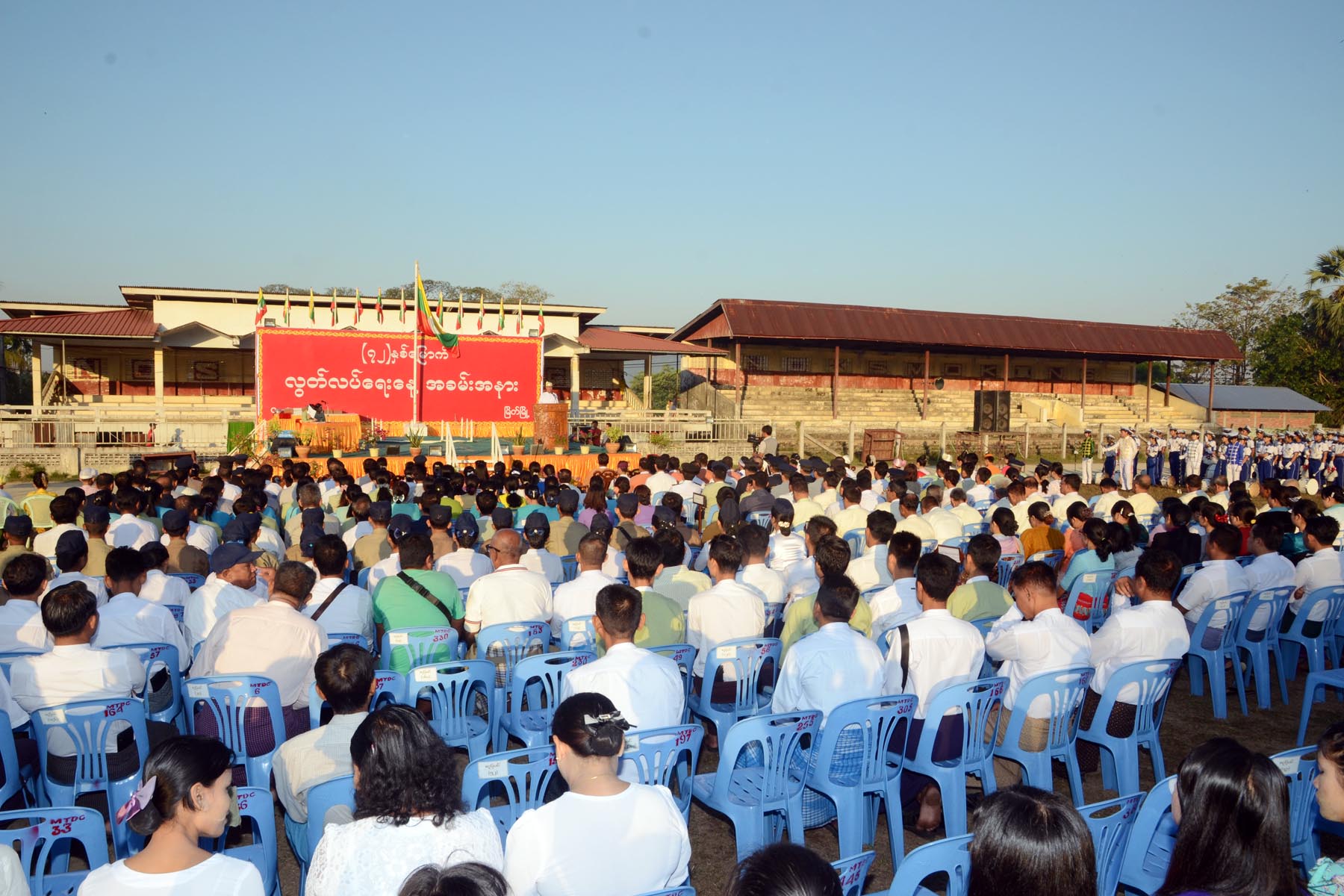 သဝဏ်လွှာ ဖတ်ပွဲအခမ်းအနားကို နံနက်(၇)နာရီက ဆက်လက်ကျင်းပခဲ့ရာ ရှေးဦးစွာ နိုင်ငံတော်အလံနှင့် အာဇာနည် ခေါင်းဆောင်ကြီးများအား တိုင်းဒေသကြီး လွှတ်တော်ကိုယ်စားလှယ်၊ ခရိုင်အုပ်ချုပ်ရေးမှူး နှင့် ခရိုင်/ မြို့နယ် ဌာနဆိုင်ရာ အကြီးအကဲများ၊ ဝန်ထမ်းများ၊ မြို့နယ်စည်ပင်သာယာရေးကော်မတီ၊ နိုင်ငံရေး ပါတီများ၊ လူမှုရေးအသင်းအဖွဲ့များ၊ ဆရာ/ဆရာမများနှင့် ကျောင်းသား/ကျောင်းသူများ၊ တိုင်းရင်းသား/ တိုင်းရင်းသူလေးများ၊ ပြည်သူများက စုပေါင်းညီညာစွာ ဦးညွှတ် အလေးပြုခဲ့ကြသည်။
