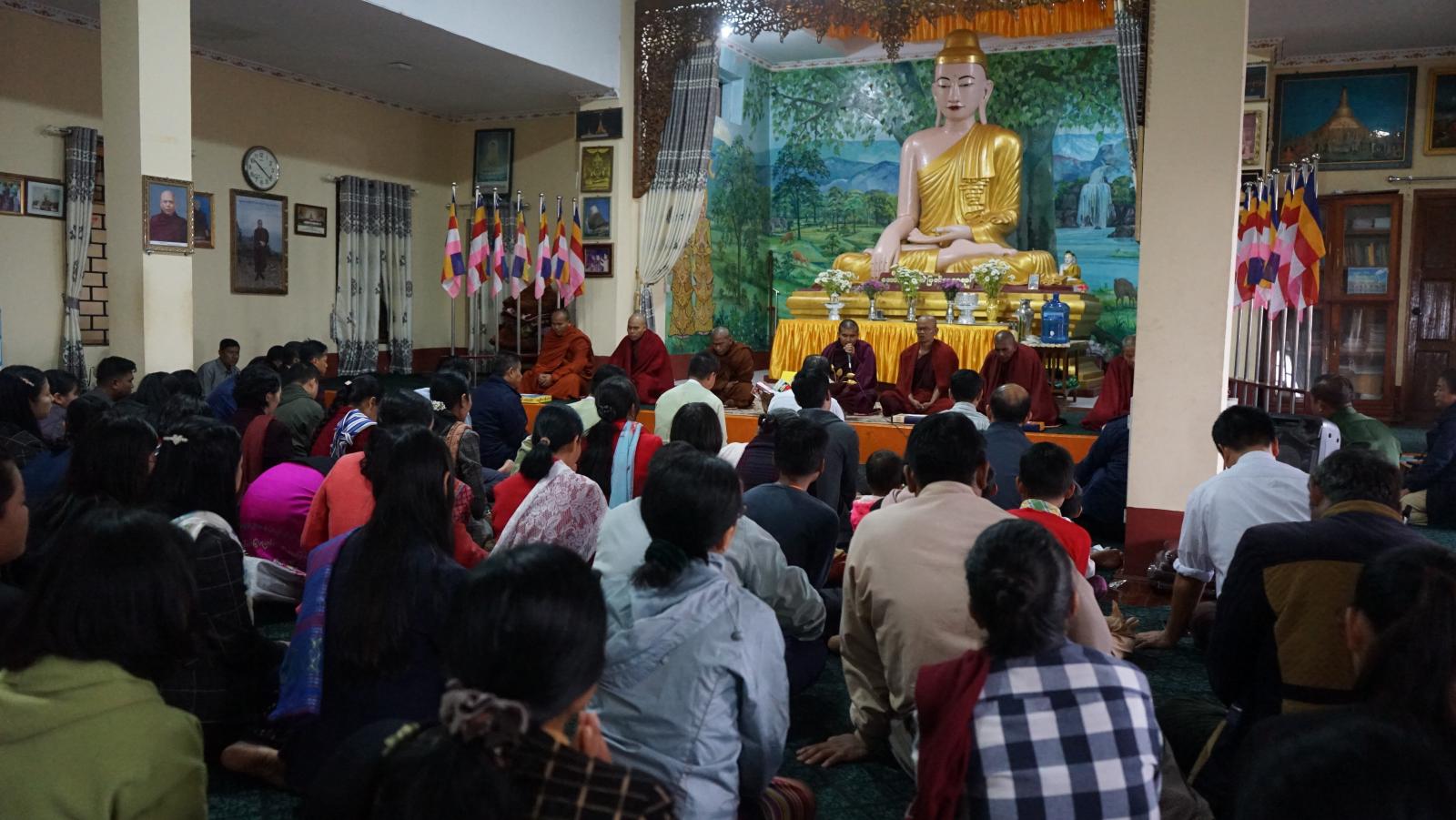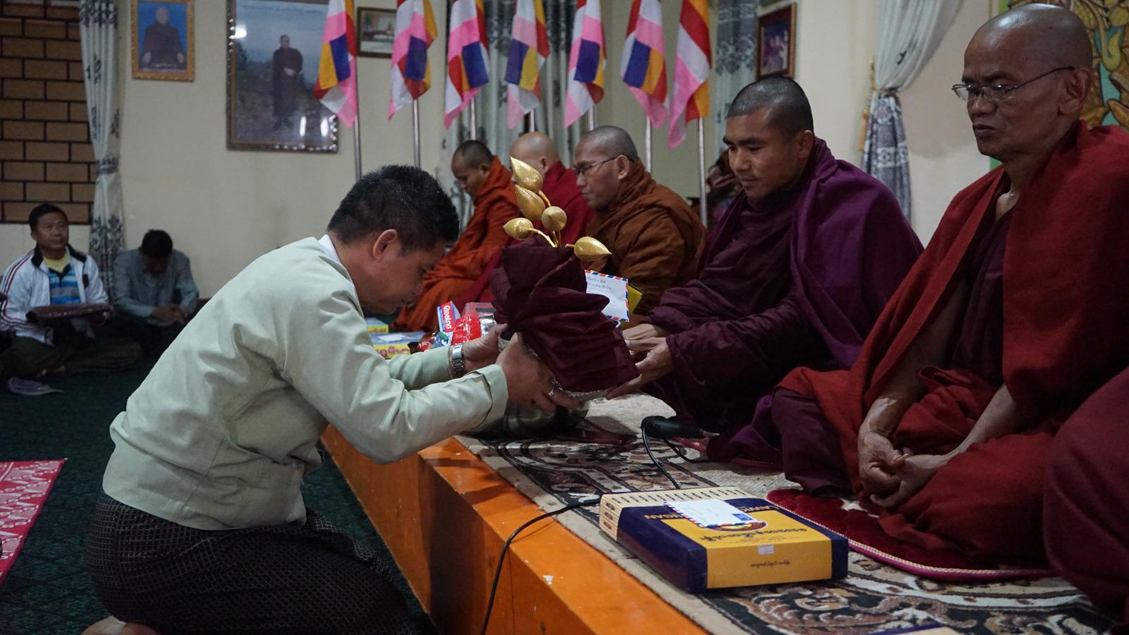 ရှေးဦးစွာ နမောတဿ မဟာပဏာမဖြင့် အခမ်းအနားကို ဖွင့်လှစ်ပြီး တစ်မိုင်သာသနာပြုဌာန၊ လက်ထောက်သာသနပြု ဆရာတော် ဘဒ္ဒန္တ ပညာဇောတ (သာသနတက္ကသီလမဟာဓမ္မစရိယ၊ M.A Buddhism) ထံမှ (၈)ပါးသီလ ခံယူဆောက်တည်ကြသည်။ ထို့နောက်ဆရာတော်၊ သံဃာတော် အရှင်သူမြတ်များ ရွတ်ပွားသရစ္ဇျာယ်တော်မူကြသည့် ပရိတ်တရားတော်များ နာယူကြည်ညိုပူဇော်ကြပြီး ဖလမ်းခရိုင်စီမံအုပ်ချုပ် ရေးအဖွဲ့ဥက္ကဋ္ဌ ဦးစောထွန်းဝင်းနှင့် အဖွဲ့ဝင်များက ဝါဆိုသင်္ကန်းနှင့် လှူဖွယ်ဝတ္ထုပစ္စည်းများ ဆက်ကပ်လှူဒါန်းကြသည်။