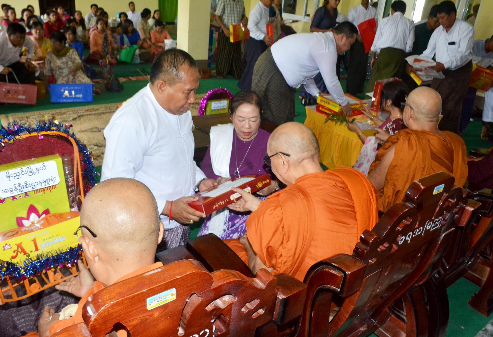 ဆက်လက်၍ ဆရာတော်/သံဃာတော်များက မေတ္တာသုတ်တရားတော်အား ချီးမြှင့်တော်မူပြီး ဝါဆိုသင်္ကန်းနှင့် လှူဖွယ်အစုစုတို့ကို အသီးသီးဆက်ကပ်လှူဒါန်းကြကာ ခရိုင်/မြို့နယ် ဌာနဆိုင်ရာများက ယင်းလှူဒါန်းမှုအစုစုတို့အတွက် ရေစက်သွန်းချအမျှပေးဝေခဲ့ကြသည်။