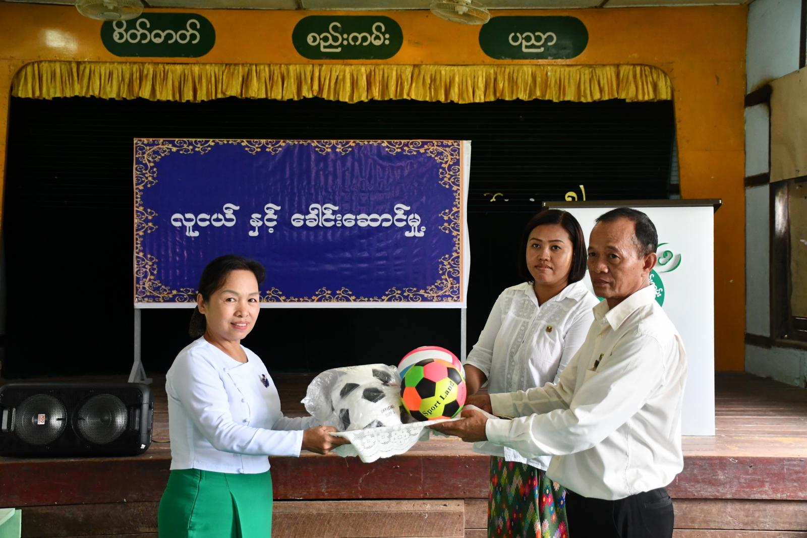 ဆက်လက်၍ ခရိုင်စားသုံးသူရေးရာဦးစီးဌာနမှ ဒုတိယဦးစီးမှူး ဒေါ်နှောင်းနှောင်းဝင်းက စားသုံးသူရေးရာအကြောင်း အသိပညာပေးဟောပြောခြင်းနှင့် ခရိုင်အားကစားနှင့်ကာယပညာ ဦးစီးဌာနမှ လက်ထောက်ညွှန်ကြားရေးမှူး ဦးကြည်စိုးက လူငယ်နှင့်ခေါင်းဆောင်မှုအကြောင်း အသိပညာပေးဟောပြောခဲ့ပြီး အားကစားပစ္စည်းများလှူဒါန်းပေးအပ်ရာ ကျောင်းအုပ်ဆရာမကြီးက လက်ခံရယူခဲ့ကြောင်း သိရသည်။