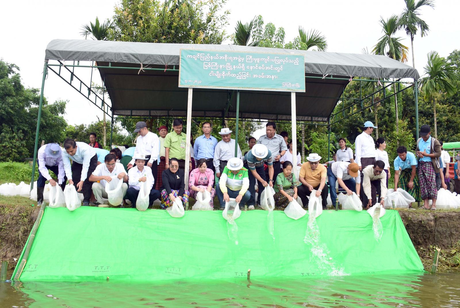 ကချင်ပြည်နယ်အတွင်း ငါးစားသုံးမှုဖူလုံစေရေးနှင့် ငါးထုတ်လုပ်မှု တိုးတက်မြှင့်မားလာစေရေးအတွက် မြစ်ကြီးနားမြို့နယ်အတွင်း နောင်စပ်အင်းနှင့် တာလောကြီးအင်းအတွင်း ငါးမျိုးစိုက်ထည့်မွေးမြူရန် ငါးသားပေါက်နှင့် ငါးအစာအိတ်များပေးအပ်ခြင်းအခမ်းအနားကို ယမန်နေ့ နံနက် ၉ နာရီက ပြည်နယ်အစိုးရအဖွဲ့ရုံးဝင်းအတွင်းရှိ ဆမားဒူဝါဆင်ဝါးနော်ခန်းမ၌ ကျင်းပပြုလုပ်သည်။