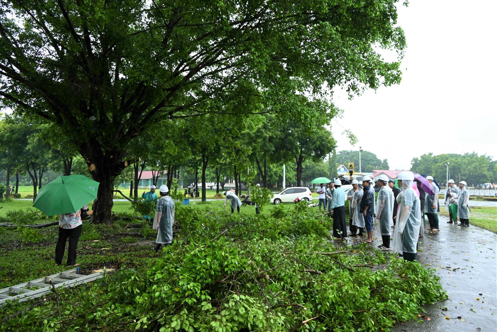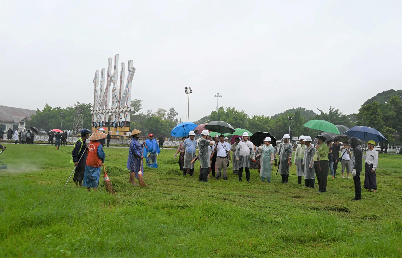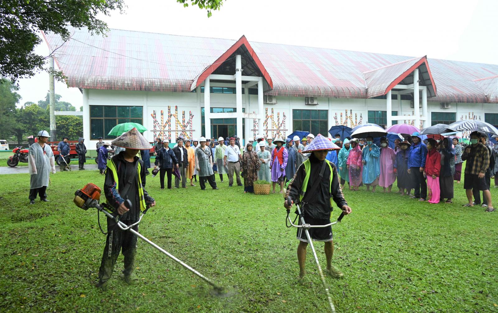 ရှေးဦးစွာ ပြည်နယ်အစိုးရအဖွဲရုံးဝင်း၌ သန့်ရှင်းရေးလုပ်ငန်းဆောင်ရွက်နေမှုများကို ပြည်နယ် ဝန်ကြီးချုပ် ဦးခက်ထိန်နန်နှင့်ဇနီး ဒေါ်နန်ဆိုင်း၊ ပြည်နယ်အစိုးရအဖွဲ့ဝင် ဝန်ကြီးများနှင့် ၎င်းတို့၏ ဇနီးများက ပြည်နယ်အထွေထွေအုပ်ချုပ်ရေးဦးစီးဌာန အရာထမ်း/ အမှုထမ်းများ၊ လုံခြုံရေးတပ်ဖွဲ့ဝင် များနှင့်အတူ ရုံးပင်မဆောင်ပတ်ဝန်းကျင်နှင့် ရုံးဝင်းအတွင်း သစ်ပင်ခြုံနွယ်များ ခုတ်ထွင်ရှင်းလင်း ခြင်း၊ အမှိုက်များကောက်ယူခြင်းတို့ကို စုပေါင်းဆောင်ရွက်ခဲ့ကြပြီး ဝန်ထမ်းများအား နံနက်စာအဖြစ် ကောက်ညှင်းပေါင်းနှင့် လက်ဘက်ရည်ဘူးများ ဖြန့်ဝေကျွေးမွေးခဲ့ကြသည်။
