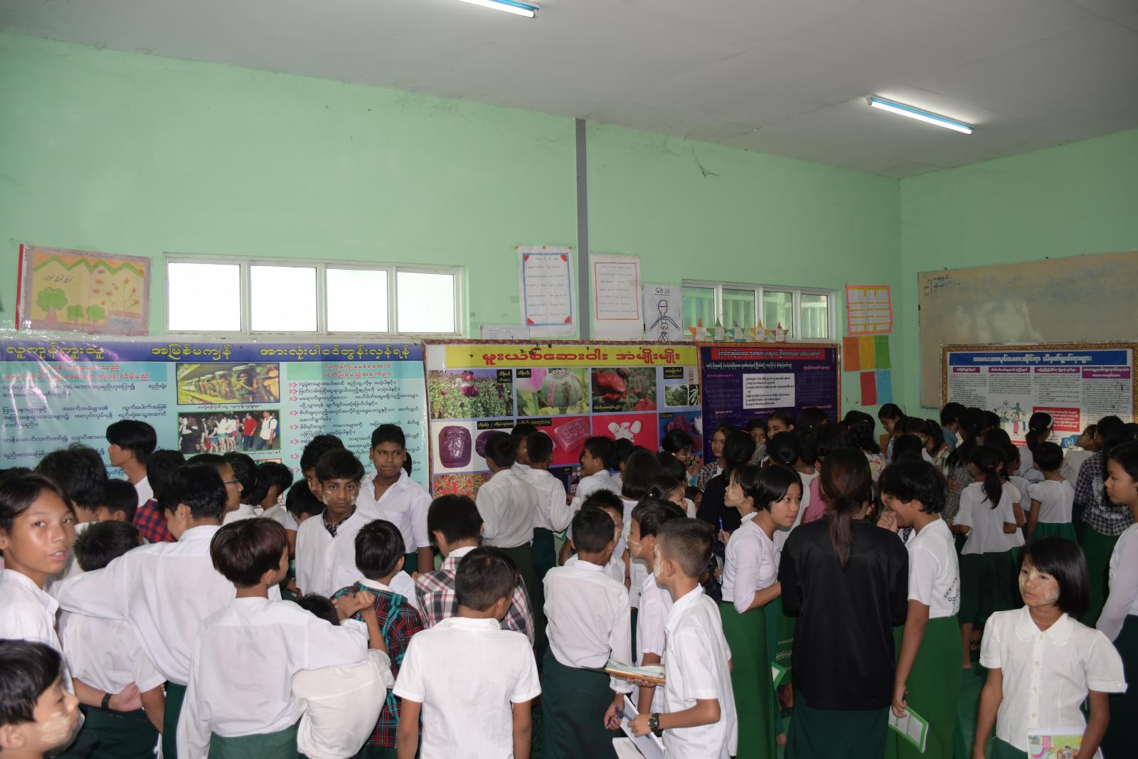 ထို့နောက် ခင်းကျင်းပြသထားသည့် အသိပညာပေးနံရံကပ်စာစောင်များကို ကျောင်းသားကျောင်းသူများက ကြည့်ရှုလေ့လာကြကြောင်းသိရသည်။