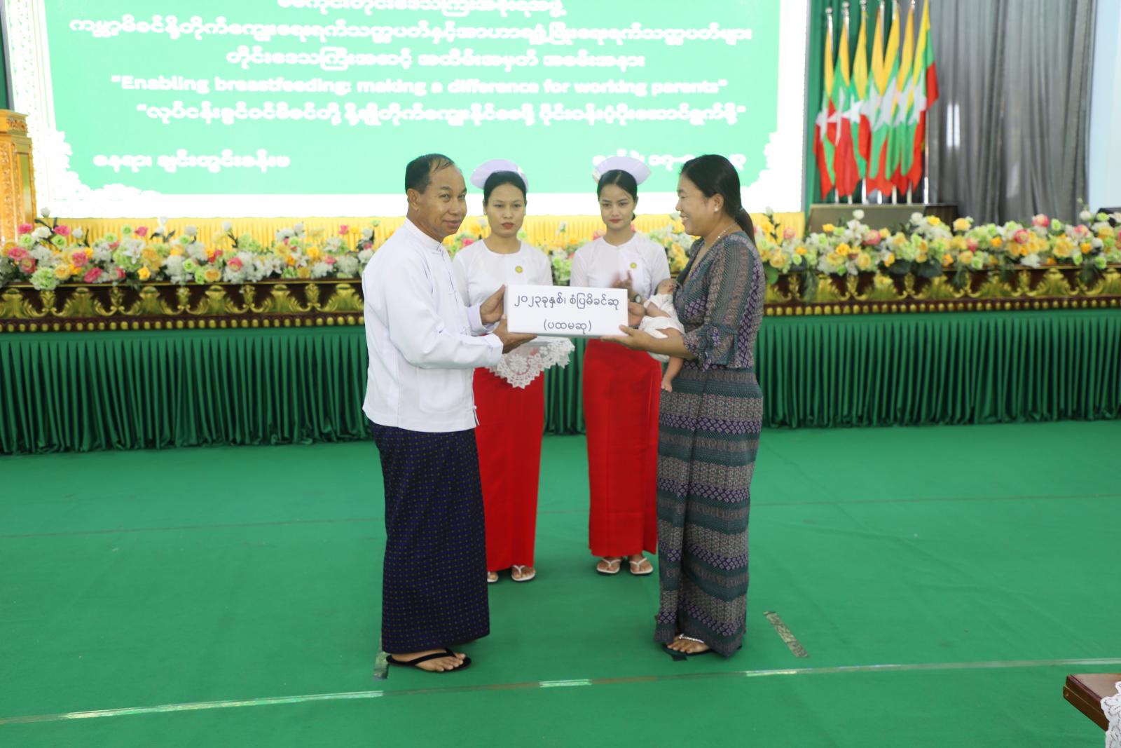 ထို့နောက် တိုင်းဒေသကြီး ဝန်ကြီးချုပ်နှင့် တာဝန်ရှိသူများက စံပြမိခင်ဆု ပထမ၊ ဒုတိယ၊ တတိဆုရရှိကြသူများအား ဂုဏ်ပြုဆုများ ပေးအပ်ချီးမြှင့်ပြီး တာဝန်ရှိသူများနှင့်အတူ စုပေါင်း မှတ်တမ်းတင် ဓါတ်ပုံရိုက်ကူးကာ အခမ်းအနားသို့ တက်ရောက်လာကြသော အသက် ၅ နှစ် အောက်ကလေးငယ်များအား အင်အားဖြည့်ဗီတာမင်အေဆေးလုံးများ လိုက်လံတိုက်ကျွေးကြပြီး အမှတ်တရလက်ဆောင်များ အသီးသီး ပေးအပ်ကာ အခမ်းအနားကို ရုပ်သိမ်းခဲ့သည်။