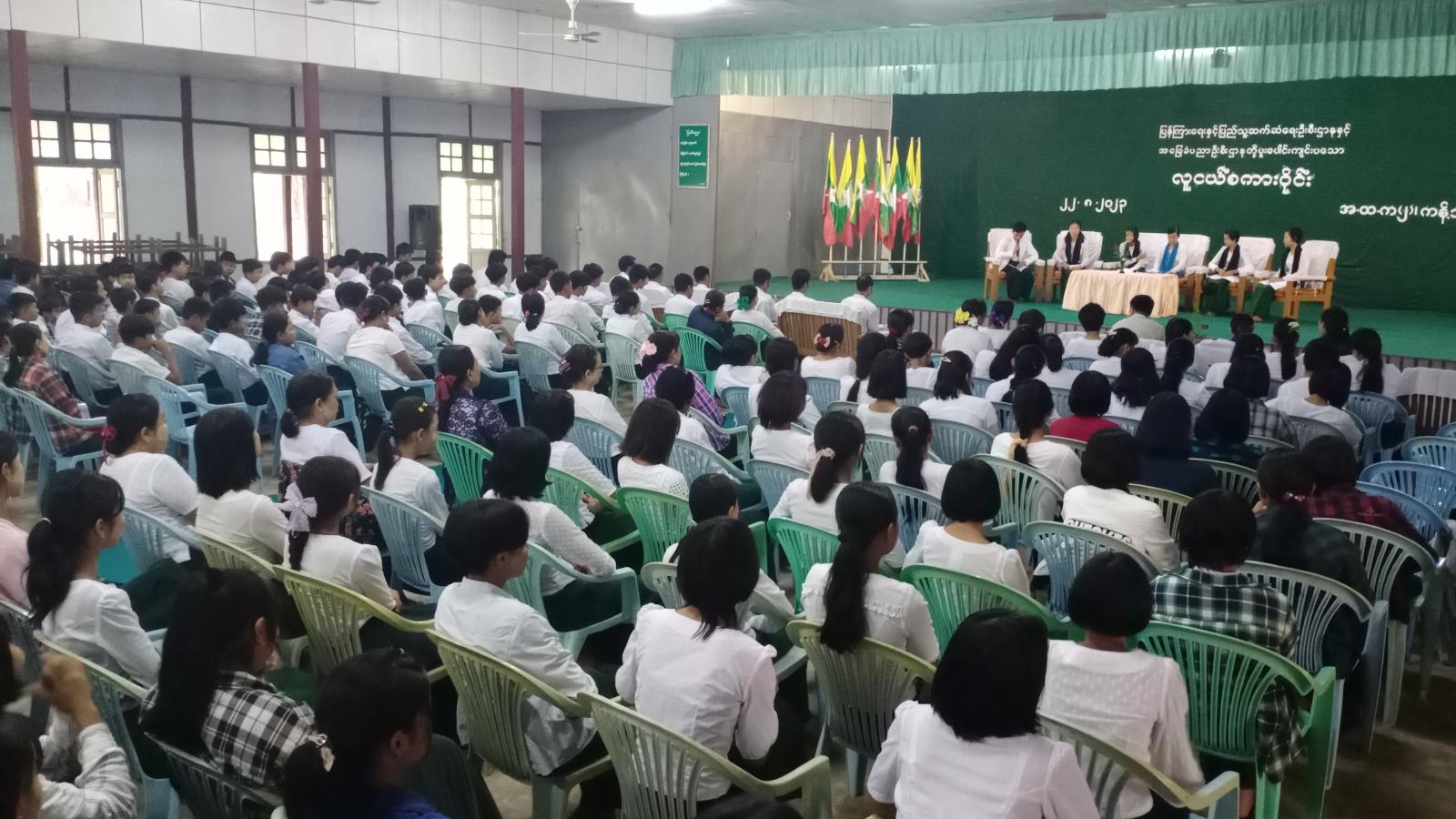 ဆက်လက်၍ လူငယ်စကားဝိုင်းဆွေးနွေးပွဲကို ကျင်းပရာ ခရိုင်ပြန်ကြားရေးနှင့်ပြည်သူ့ဆက်ဆံဦးစီးဌာနမှ ဦးစီးအရာရှိ ဒေါ်ကြည်ဆန်းက ဦးဆောင်ဆွေးနွေးသူ အဖြစ်ဆောင်ရွက်ပြီး အ.ထ.က(၂)မှ ကျောင်းသား၊ ကျောင်းသူများက လူငယ်နှင့်စာပေ၊ လူငယ်နှင့်ကျန်းမာရေး၊ လူငယ်နှင့်စည်းကမ်း၊ လူငယ်နှင့်အားကစား၊ လူငယ်နှင့်မူးယစ်ဆေး စသည့်ခေါင်းစဥ်များအလိုက် ဆွေးနွေးပြောကြားပြီး တက်ရောက်လာသည့် ကျောင်းသား၊ ကျောင်းသူများ၏ မေးမြန်းချက်များကို ပြန်လည်ဆွေးနွေးပြောကြားသည်။