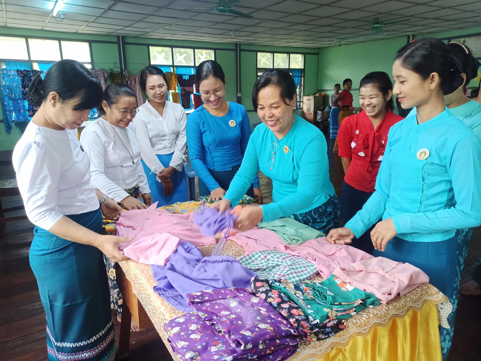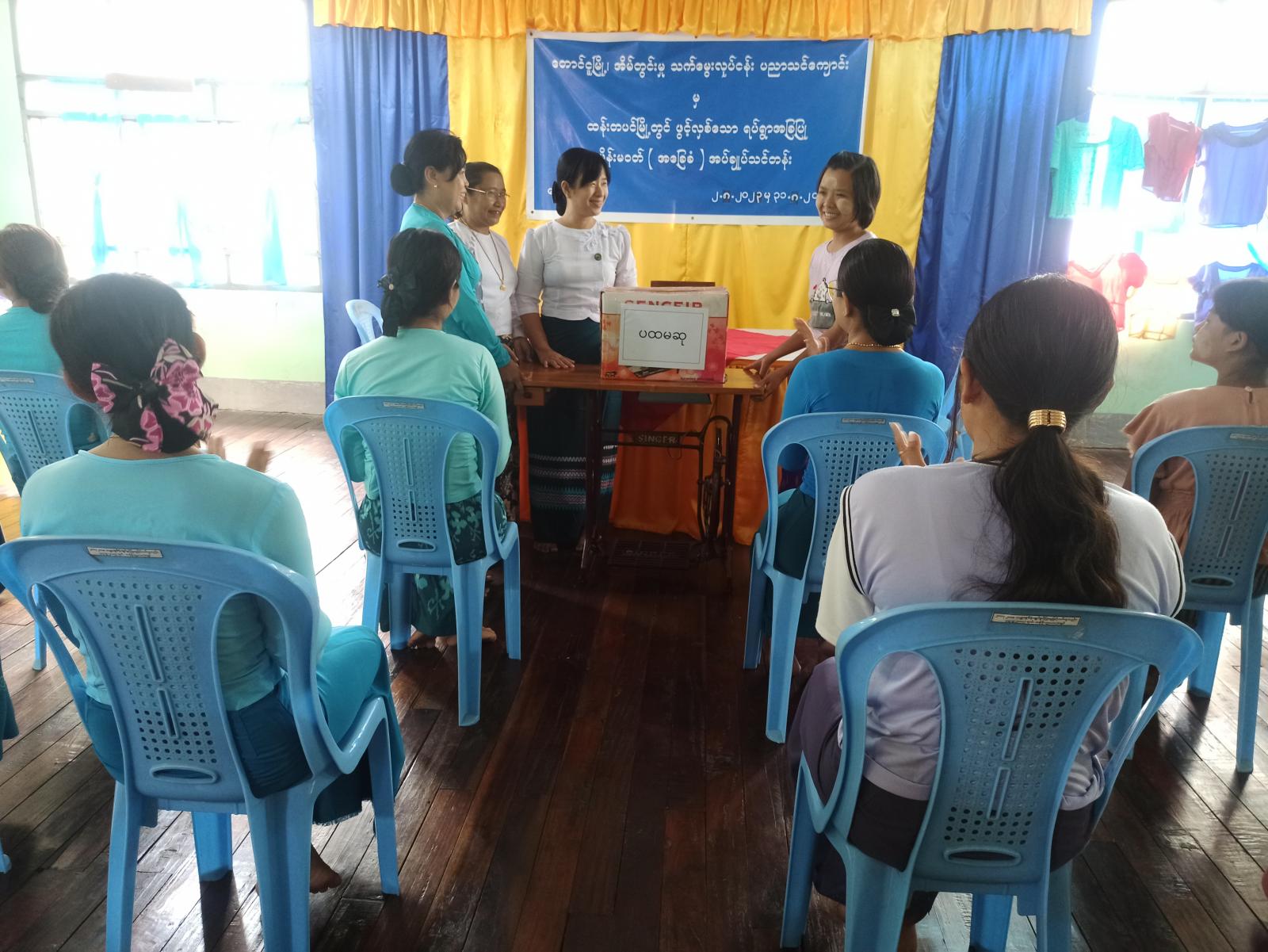 ထို့နောက်အပ်ချုပ်သင်တန်းတွင် ချုပ်ထည်များအား လက်ရာသေသပ်လှပစွာဖြင့် အပ်ချုပ်နိုင်သည့် အကောင်းဆုံးဆုရရှိသော သင်တန်းသူ မဖြိုးအိစံအား အပ်ချုပ်စက်အစုံ အသစ်တစ်လုံးကို ဂုဏ်ပြုပေးအပ်ချီးမြှင့်သည်။