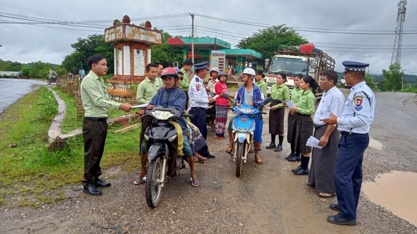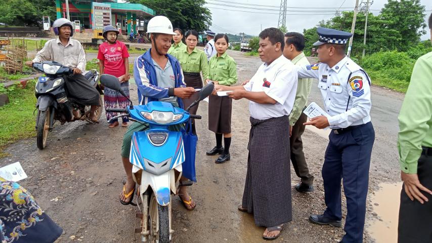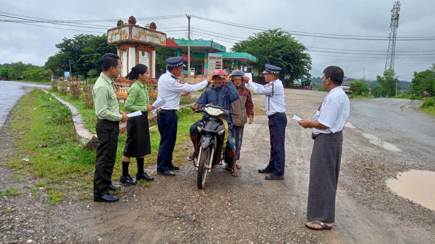 အဆိုပါ ယာဉ်စည်းကမ်းလမ်းစည်းကမ်း အသိပညာပေးဆောင်ရွက်ရာတွင် အမှတ် (၂၁) ယာဉ်ထိန်း ရဲတပ်ဖွဲ့စု၊ အမ်းယာဉ်ထိန်းရဲတပ်ဖွဲ့စိတ်မှ တပ်ဖွဲ့စိတ်မှူးဒုရဲအုပ် သန့်ဇင်ဦးနှင့် တပ်ဖွဲ့ဝင်များ အထွေထွေအုပ်ချုပ်ရေးဦးစီးဌာနမှ ဒုတိယဦးစီးမှူး ဒေါ်သက်မွန်ဖြိုးနှင့်ဝန်ထမ်းများ၊ ပြန်ကြားရေးနှင့်ပြည်သူဆက်ဆံရေးဦးစီးဌာန မြို့နယ်ဦးစီးမှူး ဦးစန်းဝင်းတို့ပူးပေါင်း၍ မော်တော်ဆိုင်ကယ် (၃၀) စီးခန့်အား မော်တော်ဆိုင်ကယ်စီးနှင်းရာတွင် နှစ်ဦးထက်ပိုမစီးနင်းကြရန်၊ ဆိုင်ကယ်စီးသူတိုင်း လုံခြုံစိတ်ချရသော ဆိုင်ကယ်ဦးထုပ်ဆောင်းခြင်း မေးသိုင်းကြိုးတပ်ဆင် မောင်းနှင်ကြရန် လမ်းညာဘက်သို့ ကပ်မောင်းကြရန်နှင့် ယာဥ်စည်းကမ်းလိုက်နာမှုမရှိသောကြောင့် သေဆုံးသူများရှိလာသဖြင့် ယာဉ်စည်းကမ်းလမ်း စည်းကမ်းနှင့်အညီ လိုက်နာမောင်းနှင်ကြရန် ယာဉ်မောင်းသူ လမ်းအသုံးပြုသူများ တစ်ဦးချင်းကိုယ်စီအသိဖြင့် လိုက်နာဖို့လိုအပ်ကြောင်းပြောကြားပြီး ယာဉ်စည်းကမ်းလမ်းစည်းကမ်း အသိပညာပေးလက်ကမ်းစာစောင် ယာဉ်ထိန်းရဲတပ် ဖွဲ့စုမှ (၁၅၀) စောင် ပြန်ကြားရေးနှင့်ပြည်သူဆက်ဆံရေးဦးစီးဌာနမှ (၃၀) စောင် စုစုပေါင်း (၁၈၀) စောင်အားဖြန့်ဝေပေးခဲ့ကြောင်း သိရသည်။