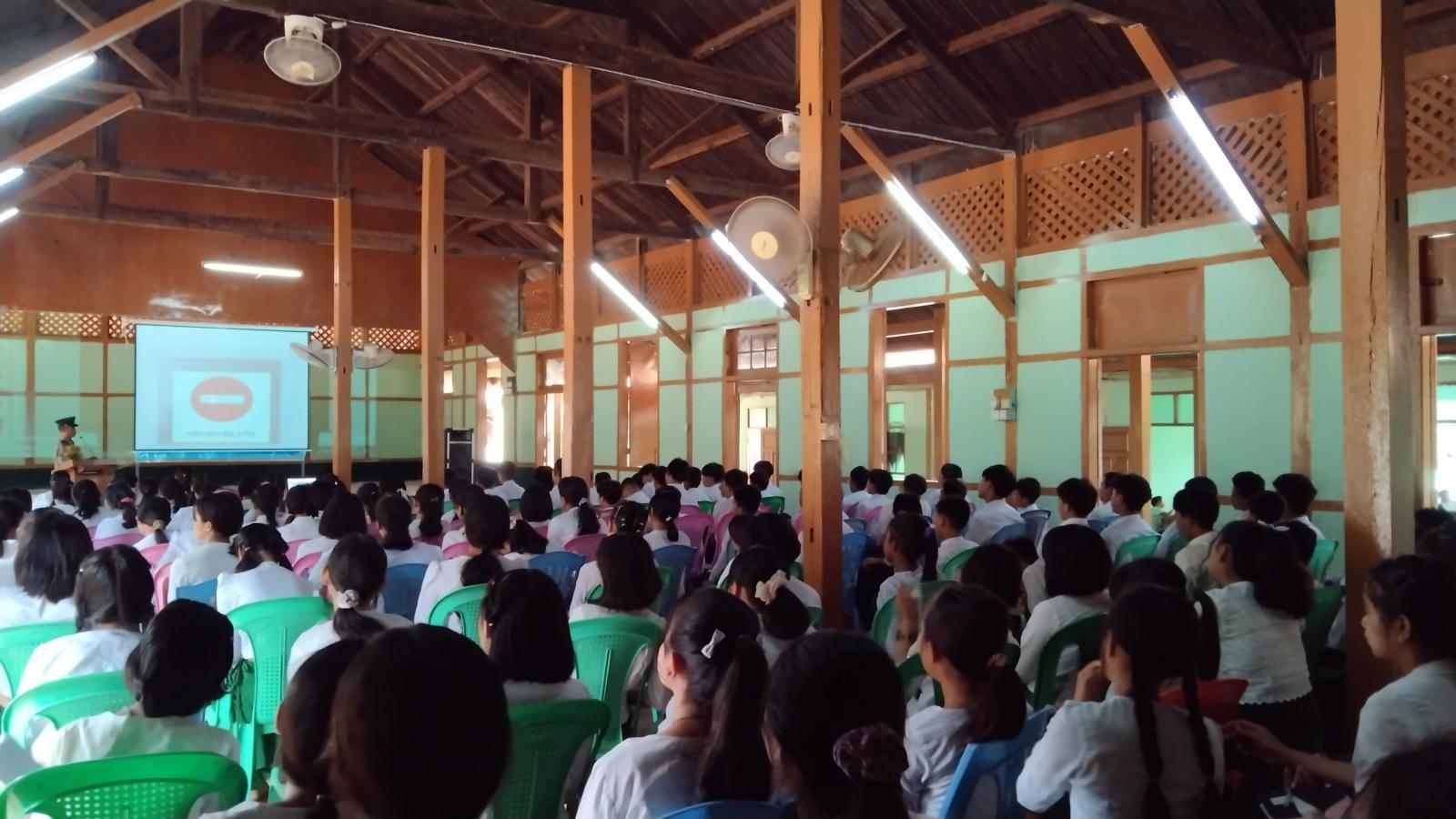 ရှေးဦးစွာ ဒုတိယမြို့နယ်ပညာရေးမှူး ဦးစိုင်းစိုးမောင်က အမှာစကားပြောကြားပြီး မြို့နယ်ရဲတပ်ဖွဲ့မှူး ရဲမှူးသန်းဆွေဦးက ယာဉ်စည်းကမ်း၊ လမ်းစည်းကမ်းနှင့် ပတ်သက်၍ သတိပြု လိုက်နာဆောင်ရွက်ရန်များအား အသိပညာပေးဆွေးနွေး ဟောပြောခဲ့သည်။