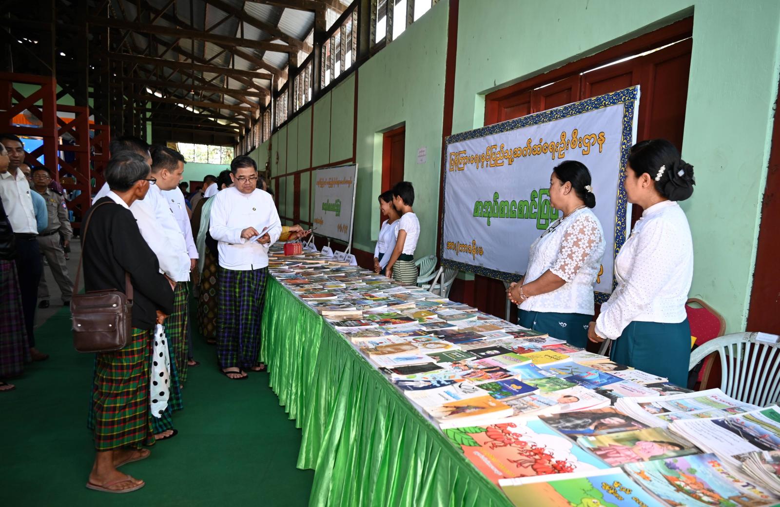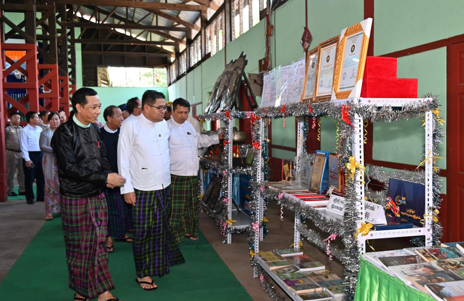 ထို့နောက် ပြည်နယ်ဝန်ကြီးချုပ်နှင့် တက်ရောက်လာသူများက ခန်းမအတွင်းခင်းကျင်းပြသထားသည့် ကချင်ပြည်နယ်အားကစားကဏ္ဍတွင် ရရှိခဲ့သည့်ဆုတံဆိပ်နှင့် တံခွန်စိုက်ဒိုင်းဆုများ၊ ပြန်ကြားရေးနှင့်ပြည်သူ့ဆက်ဆံရေးဦးစီးဌာနနှင့် ကချင်ပြည်နယ်စာကြည့်တိုက်များဖောင်ဒေးရှင်းတို့ မှခင်းကျင်းပြသထားသည့် သုတ/ရသစာအုပ်စာစောင်များကို လှည့်လည်ကြည့်ရှုအားပေးခဲ့ကြ ကြောင်းသိရှိရသည်။
