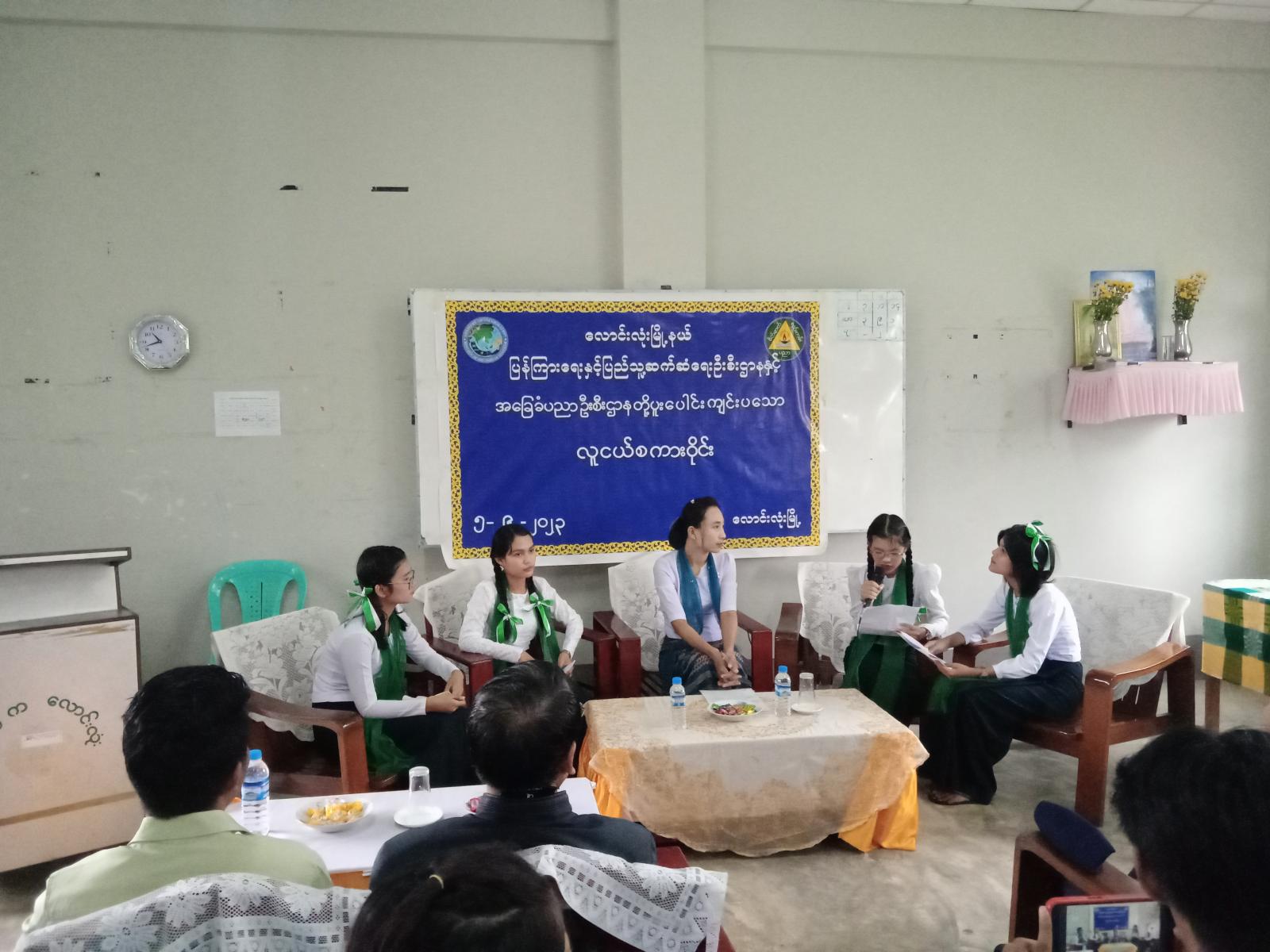 ထို့နောက်မြို့နယ် ပြန်ကြားရေးနှင့်ပြည်သူ့ဆက်ဆံရေးဦးစီးဌာန၊ ဦးစီးအရာရှိ ဒေါ်သိန်းသိန်းက လူငယ်များ အချင်းချင်း အသိပညာ၊ အတတ်ပညာ၊ ဗဟုသုတနှင့် ကျင့်ဝတ်တန်ဖိုးများ မျှဝေပေးရန်၊ အနာဂတ်လူ့ဘောင်အဖွဲ့ အစည်းအား ၎င်းတို့၏ အတွေးအမြင်ကောင်းများဖြင့် အကောင်အထည်ဖော် တည်ဆောက်ရန်နှင့် လူငယ်များကာယ၊ ဉာဏ၊ စာရိတ္တ၊ မိတ္တ၊ ဘောဂဟူသော ဗလငါးတန် ဖွံ့ဖြိုးတိုးတတ်စေရန်၊ လူငယ်များအား နှုတ်မှုစွမ်းရည် တိုးတက်လာ စေရန်၊ ကျန်းမာ ကြံ့ခိုင်သောလူငယ်များဖြစ်လာစေရန်၊ စာဖတ်စွမ်းရည်တိုးတက်လာစေရန်နှင့် အသိပညာဗဟုသုတ များ တိုးပွားလာစေရန် စသည့်ရည်ရွယ်ချက်ဖြင့်ကျင်းပရခြင်းဖြစ်ကြောင်းနှင့် ဌာန၏လုပ်ငန်းဆောင်ရွက်ချက်များအား ရှင်းလင်းပြောကြားသည်။