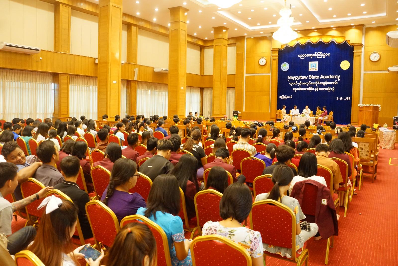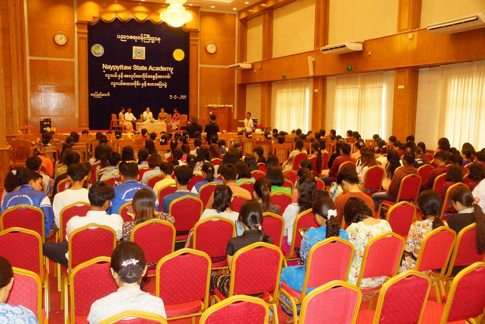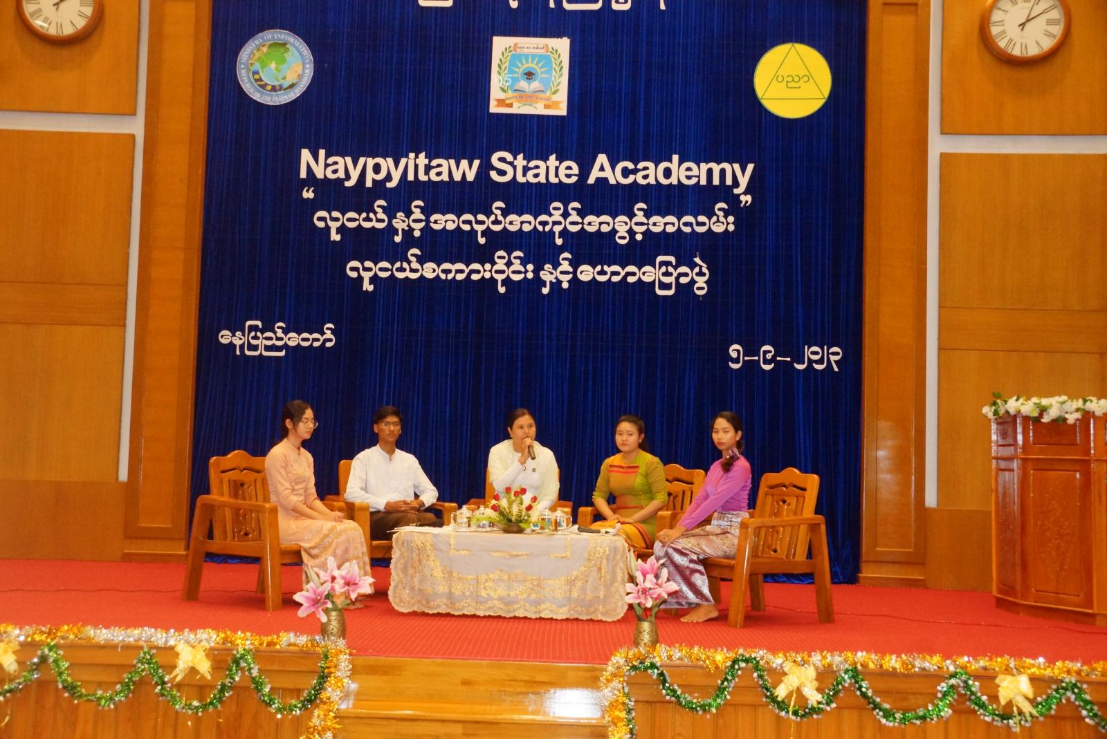 အနာဂါတ်မြန်မာနိုင်ငံတော်တွင် အားကိုးအားထားပြုထိုက်သည့် လူ့စွမ်းအားအရင်းအမြစ်များ ပေါ်ထွန်းလာရေးကိုရည်ရွယ်၍ (Naypyitaw State Academy) ၏ ဗလငါးတန်ဖွံ့ဖြိုးရေး လူငယ်သီတင်းပတ် (Youth Week) အစီအစဉ်အနေဖြင့် လူငယ်များဉာဏဗလနှင့် ဘောဂဗလပြည့်စုံစေရေးအတွက် လူငယ်နှင့်အလုပ်အကိုင် အခွင့်အလမ်းခေါင်းစဉ်ဖြင့် စကားဝိုင်းဆွေးနွေးပွဲနှင့် ဟောပြောပွဲကို ယမန်နေ့မွန်းလွဲပိုင်းတွင် (Naypyitaw State Academy) ဘက်စုံခန်းမ၌ကျင်းပရာ ပညာရေးဝန်ကြီးဌာန၊ ဒုတိယဝန်ကြီး ဦးမိုးဇော်ထွန်းနှင့် တာဝန်ရှိသူများ၊ (Naypyitaw State Academy) မှ ဒုတိယ ပါမောက္ခချုပ်များနှင့် တာဝန်ရှိသူများ၊ ကျောင်းသား၊ ကျောင်းသူများ တက်ရောက်ကြသည်။