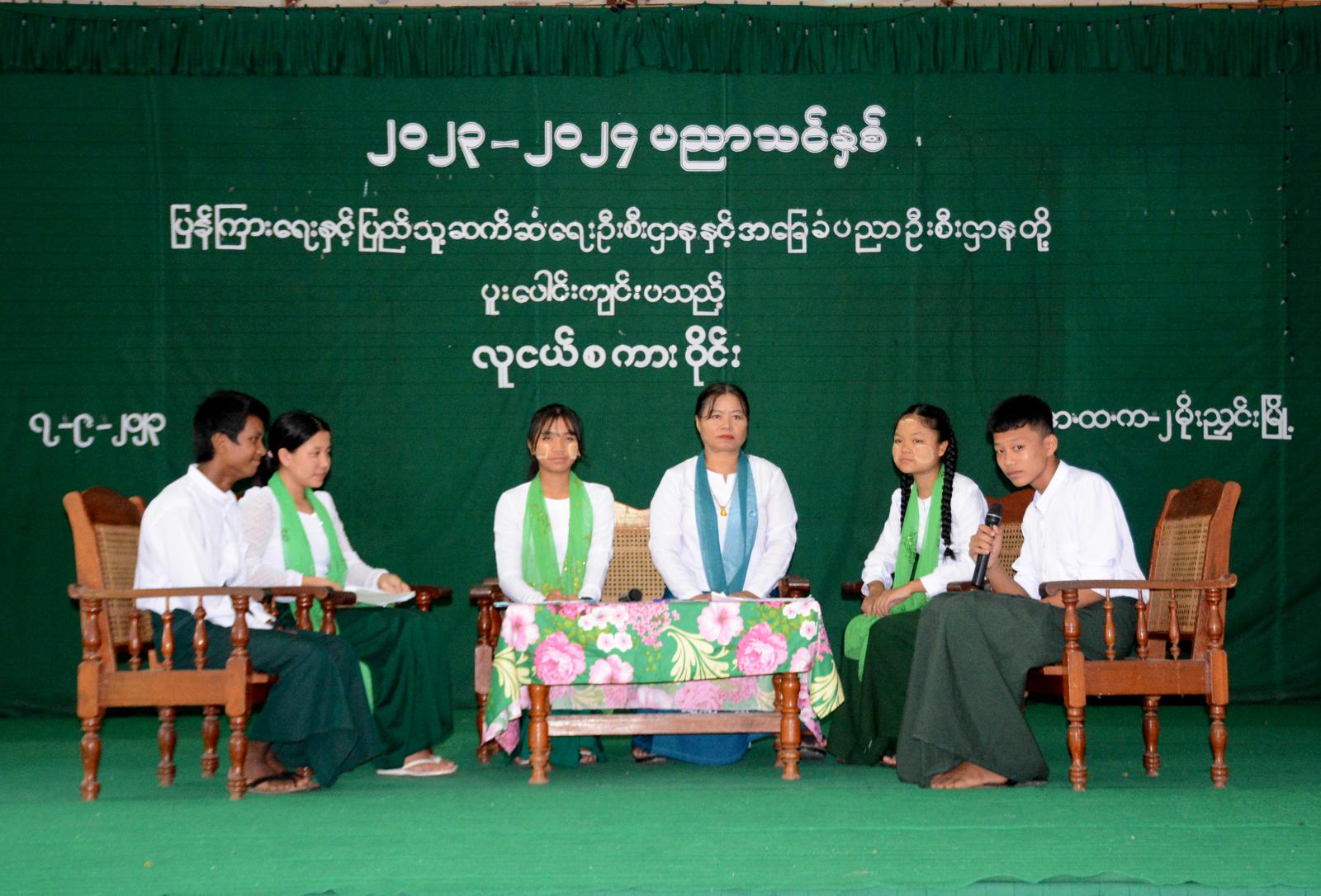 ဆက်လက်၍ လူငယ်စကားဝိုင်းတွင် ဦးဆောင်ဆွေးနွေးသူအဖြစ် ခရိုင်ပြန်ကြားရေးနှင့်ပြည်သူ့ ဆက်ဆံရေးဦးစီးဌာနမှ ဦးစီးအရာရှိ ဒေါ်တိုးတိုးမေက စတင်ဆွေးနွေးပြီး အဆိုပါအခြေခံပညာ အထက်တန်းကျောင်း Grade-11 မှ မလင်းလဲ့နေခြည်က လူငယ်နှင့်ပညာရေး၊ မောင်မြင့်နိုင်ထွန်းက လူငယ်နှင့်အားကစား၊ မမေကဗျာနုနုက လူငယ်နှင့်မူးယစ်ဆေး၊ မမေရီလုနန်က လူငယ်နှင့်စာပေနှင့် မောင်လင်းထွဋ်ခေါင်က လူငယ်နှင့် စာရိတ္တခေါင်းစဉ်တို့ဖြင့် အသီးသီးဆွေးနွေးကြရာ ကျောင်းသား ကျောင်းသူများမှ သိရှိလိုသည်များအား ပြန်လည်မေးမြန်း ဆွေးနွေးခဲ့ကြကြောင်း သိရသည်။
