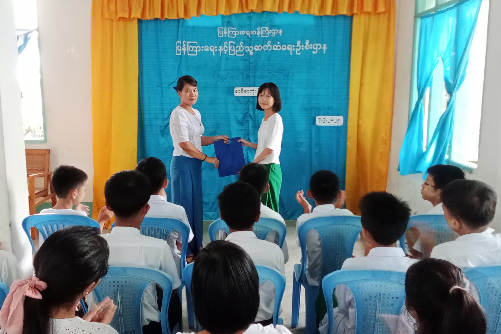 ပဲခူးတိုင်းဒေသကြီး၊ တောင်ငူခရိုင်၊ ဖြူးမြို့မ(၂)၊ အခြေခံပညာအလယ်တန်းကျောင်း(ခွဲ)ရှိ အလယ်တန်းအဆင့် ကျောင်းသား/ကျောင်းသူများအား ဖိတ်ခေါ်၍ကျောင်းစာအပြင် ပြင်ပစာပေများဖြင့် ဗဟုသုတများ ရရှိစေရန်အတွက်ရည်ရွယ်ကာ စာစီစာကုံးပြိုင်ပွဲနှင့် ဆုချီးမြှင့်ပွဲကို ယနေ့နံနက် (၁၀) နာရီအချိန်က ဖြူးမြို့နယ်ပြန်ကြားရေးနှင့်ပြည်သူ့ဆက်ဆံရေး ဦးစီးဌာနရုံး လူထုအခြေပြုဗဟိုဌာနခန်းမတွင် ပြုလုပ်ခဲ့ကြောင်း သိရသည်။