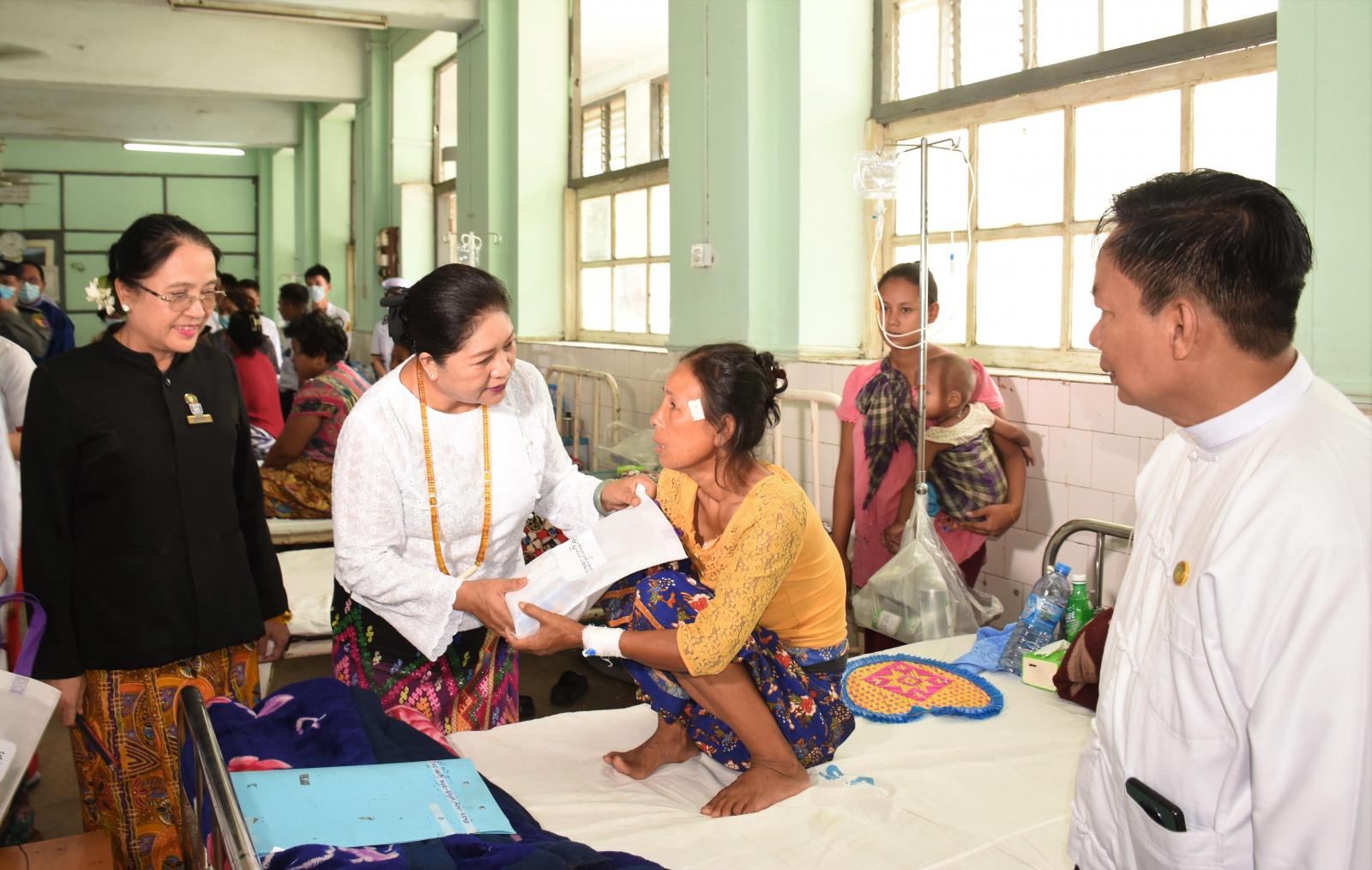 ထိုသို့တွေ့ဆုံအားပေးရာတွင် နိုင်ငံတော်စီမံအုပ်ချုပ်ရေးကောင်စီအဖွဲ့ဝင် ဒေါ်ဒွဲဘူသည် ပြည်နယ် ဝန်ကြီးချုပ်၊ ပြည်နယ်တရားလွှတ်တော် တရားသူကြီးချုပ်တို့နှင့် အတူ ပြည်သူ့ဆေးရုံကြီး အတွင်း လူနာအဖြစ် ဆေးဝါးကုသမှုခံယူနေသော လူနာများအား ရင်းရင်းနှီးနှီး လိုက်လံတွေ့ဆုံအားပေးကာ လူနာများနှင့် လူနာမိသားစုများအတွက် ထောက်ပံ့ငွေ၊ အာဟာရဖြစ် စားသောက်ဖွယ်ရာများကို လိုက်လံ ထောက်ပံ့ပေးအပ်ခဲ့ကြပြီး ဆေးရုံအတွက် ဆေးပဒေသာပင်ထောက်ပံ့ငွေများကို ထောက်ပံ့ပေးအပ်သည်။