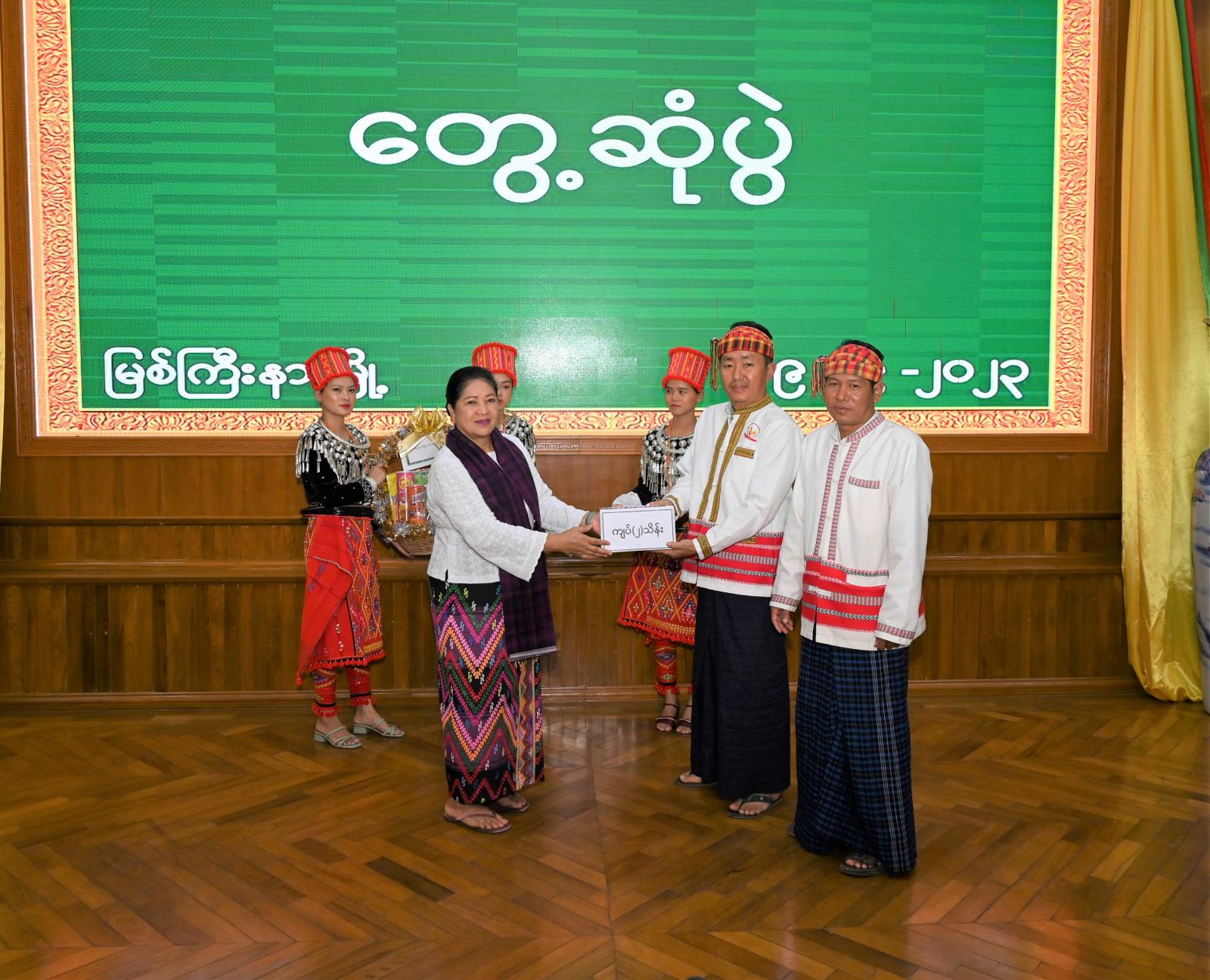 ယင်းနောက် နိုင်ငံတော်စီမံအုပ်ချုပ်ရေး ကောင်စီအဖွဲ့ဝင်က တက်ရောက်လာကြသည့် ကချင် မျိုးနွယ်စု (၆)မျိုး၊ ရှမ်းမျိုးနွယ်စု(၅)မျိုးနှင့် ဗမာတိုင်းရင်းသားမျိုးနွယ်စုတို့မှ စာပေနှင့် ယဉ်ကျေးမှု အသင်း/အဖွဲ့များနှင့် မြန်မာနိုင်ငံကချင်လူမျိုးရိုးရာယဉ်ကျေးမှုအသင်း၊ ကချင်ပြည်နယ် ရှမ်းမျိုးနွယ်စု များစာပေနှင့် ယဉ်ကျေးမှုများအသင်းတို့အတွက် ထောက်ပံ့ငွေကျပ် ၂၈ သိန်းနှင့် ဂုဏ်ပြုလက်ဆောင်များကို ပေးအပ်ချီးမြှင့်သည်။