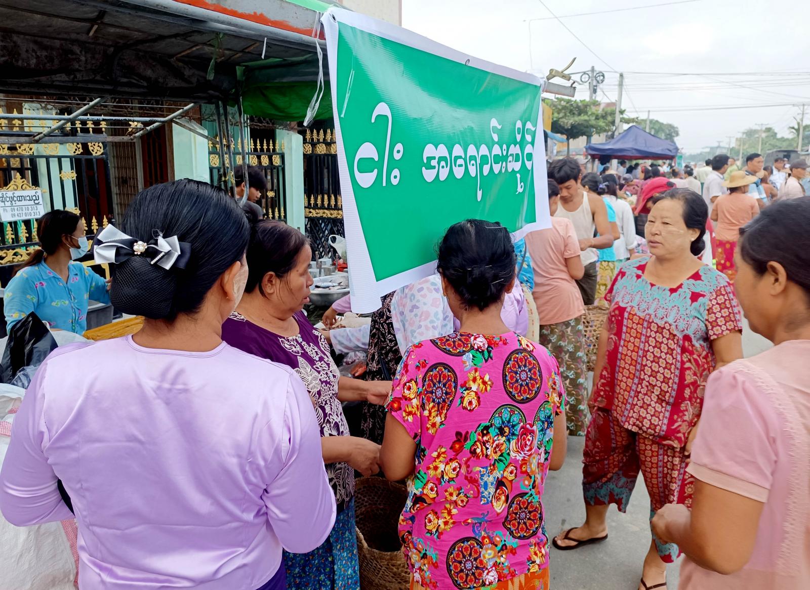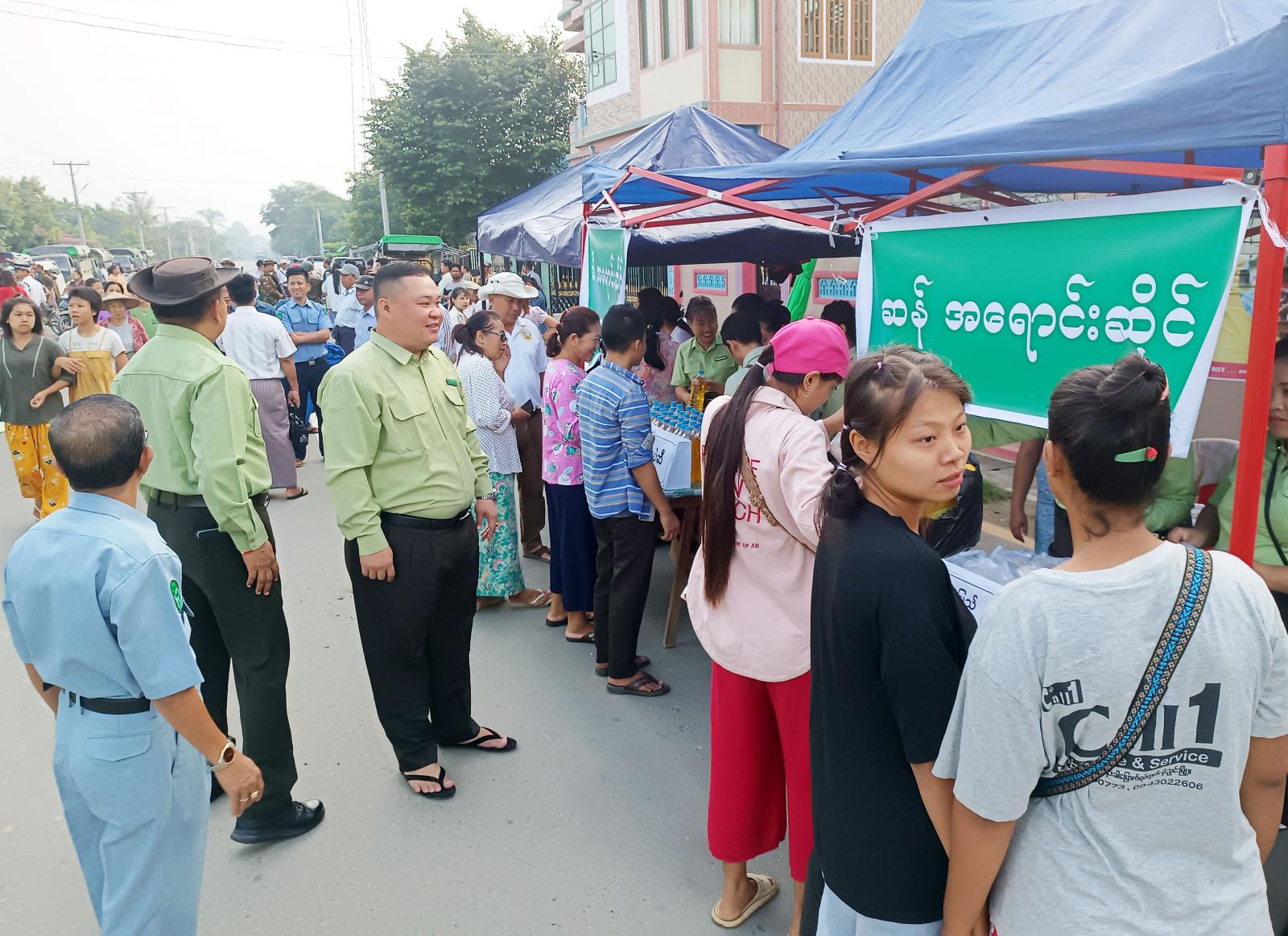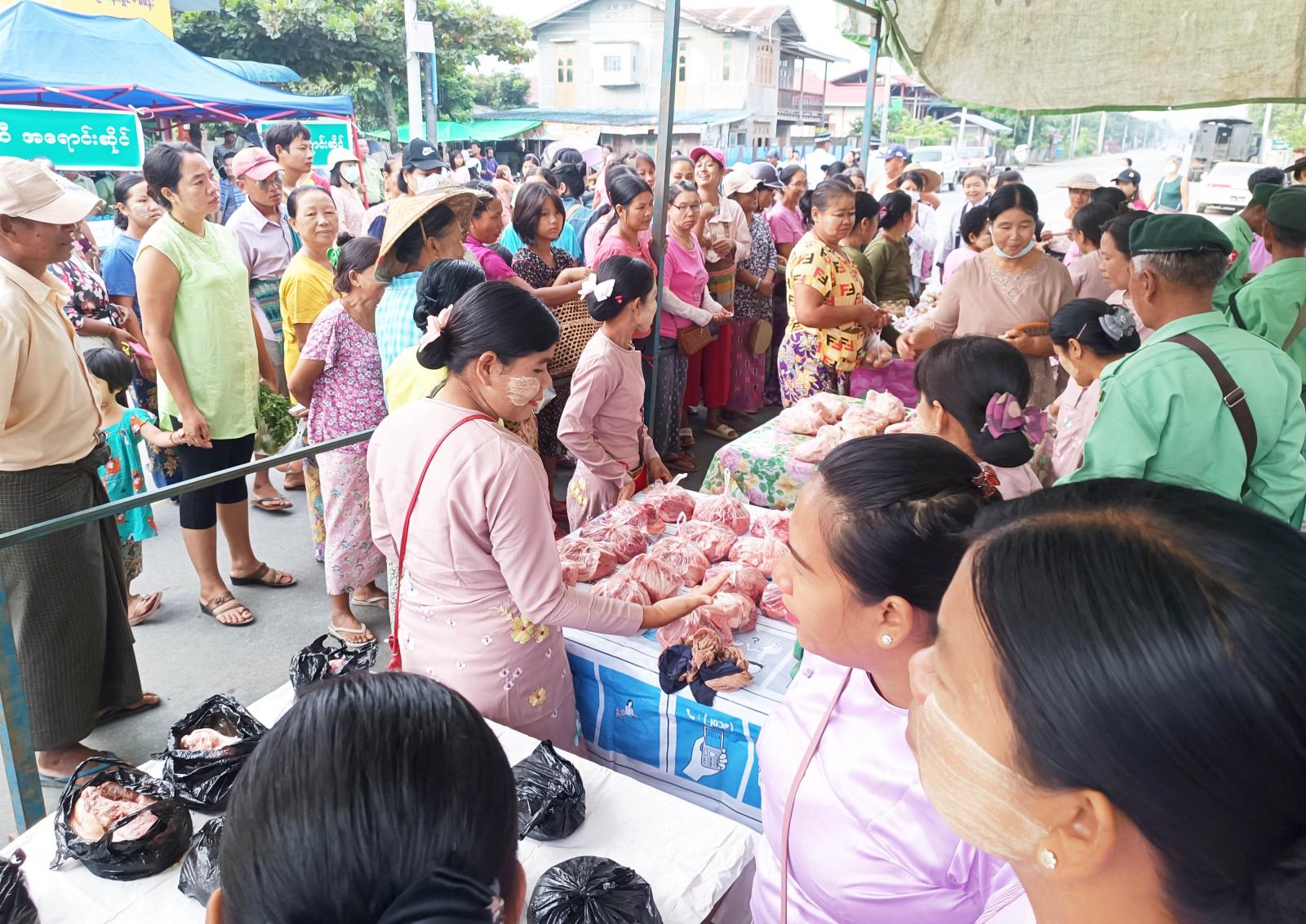 ထိုသို့ ရောင်းချပေးရာတွင် ခရိုင်စီမံအုပ်ချုပ်ရေးအဖွဲ့၏ ကြီးကြပ်မှုဖြင့် မြို့နယ်စီမံအုပ်ချုပ်ရေး အဖွဲ့၊ မြို့နယ်စည်ပင်သာယာရေးအဖွဲ့၊ နယ်မြေခံတပ်ဖွဲ့များ၊ ဆန်ကုန်သည်နှင့် ဆီကုန်သည်များပူးပေါင်း၍ အခြေခံစားသောက်ကုန်များကို ဒေသခံပြည်သူများမှ သက်သာသောဈေးနှုန်းများဖြင့် ဝယ်ယူရရှိနိုင်ရေးအတွက် သက်သာချောင်ချိရေး အရောင်းဆိုင်များကို ဖွင့်လှစ်ရောင်းချပေးလျက်ရှိသည်။