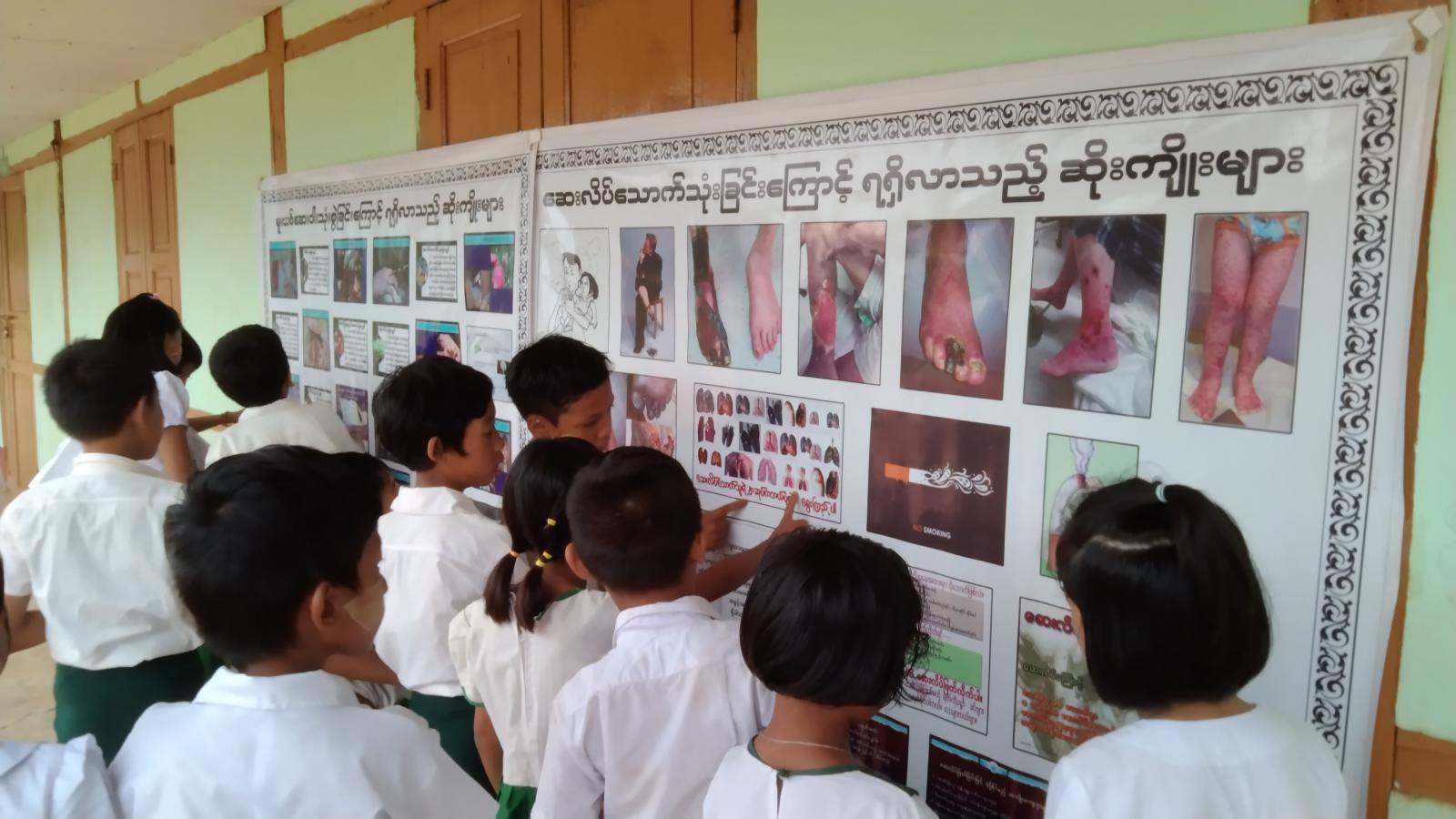 ထို့အပြင် မြို့နယ်ပြန်ကြားရေးနှင့်ပြည်သူ့ဆက်ဆံရေးဦးစီးဌာနမှ ကလေးအလုပ်သမားပပျောက်ရေး၊ မူယစ်ဆေးဝါးအန္တရာယ် တားဆီးကာကွယ်ရေးနှင့် ဆေးလိပ်သောက်သုံးခြင်းကြောင့် ရရှိနိုင်သည့် ကျန်းမာရေးဆိုင်ရာ ဆိုကျိုးအန္တရာယ်များအကြောင်း အသိပညာပေး နံရံကပ်စာစောင်အားပြသခဲ့ရာ တက်ရောက်လာသည့် ဆရာ၊ ဆရာမများနှင့် ကျောင်းသား၊ ကျောင်းသူများက စိတ်ပါဝင်စားစွာ လေ့လာကြည့်ရှုခဲ့ကြကြောင်း သိရသည်။