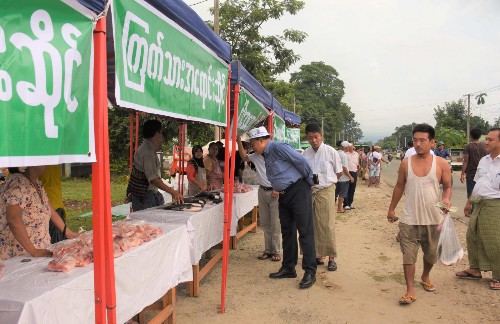 ထိုသို့ သက်သာဈေးတွင် ရောင်းချပေးသည့် ဆန်၊ ဆီ၊ ကြက်ဥ၊ ဟင်းသီးဟင်းရွက်၊ သား/ ငါး များအား ပြည်သူများ စနစ်တကျ စီတန်းဝယ်ယူ နေမှုတို့အား ပြည်နယ်ဝန်ကြီးက ကြည့်ရှုအားပေးပြီး ပြည်သူများ အဆင်ပြေလွယ်ကူစွာ ဝယ်ယူနိုင်ရေး စီမံဆောင်ရွက်ပေးသွားရန်နှင့် သား/ငါး များအား စားသုံးသူအန္တရာယ်ကင်းရှင်းစေရေး စနစ်တကျ စစ်ဆေးဆောင်ရွက်ပြီးမှ ရောင်းချသွားနိုင်ရေး တာဝန်ရှိသူ များအား မှာကြားခဲ့သည်။