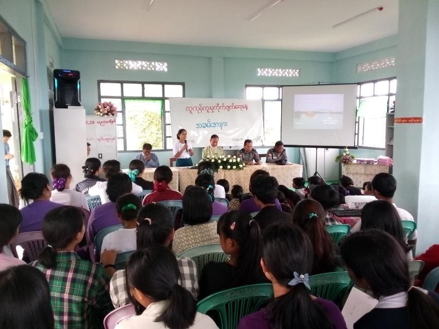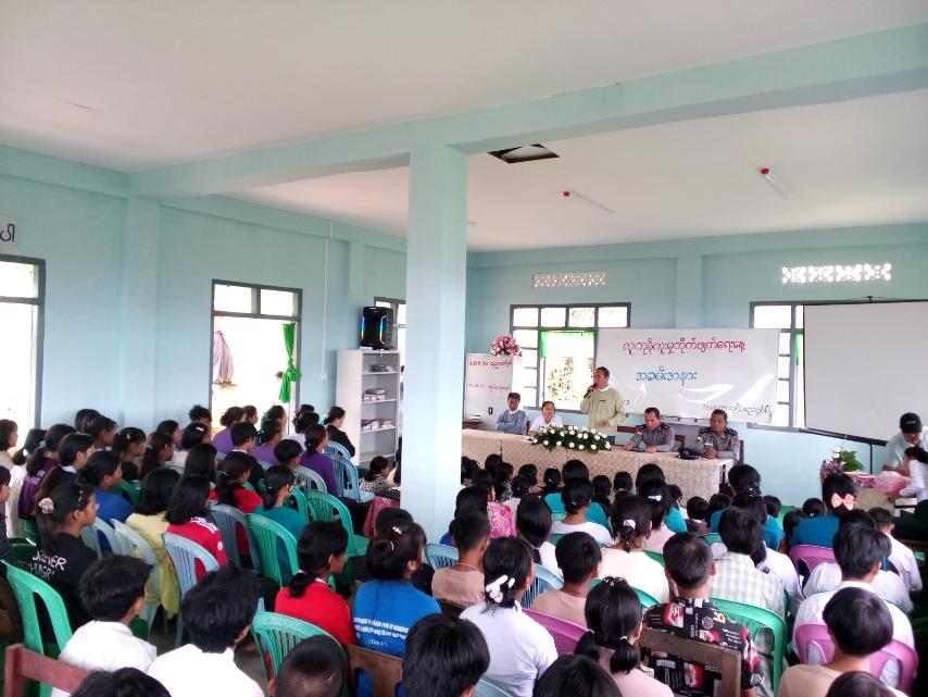 အခမ်းအနားတွင် မြို့နယ်စီမံအုပ်ချုပ်ရေးအဖွဲ့ ဥက္ကဋ္ဌ ဦးခင်မောင်မြင့်က အဖွင့်အမှာစကား ပြောကြားသည်။ ထို့နောက် မြို့နယ်ရဲတပ်ဖွဲ့မှူး ရဲမှူးဝင်းဇော်က ကျောင်းသား/ကျောင်းသူများအား လူကုန်ကူးမှုဖြစ်ပေါ်ရခြင်း အကြောင်း၊ လူကုန်ကူးမှု အမျိုးအစား၊ လူကုန်ကူးမှုတိုက်ဖျက်ရေး ဥပဒေဆိုင်ရာများ၊ လူကုန်ကူးမှုမခံရ စေရေးအတွက် ကျောင်းသား/ ကျောင်းသူများသတိပြုဆင်ခြင်စရာများကိုလည်းကောင်း၊ မြို့နယ်ပြန်ကြားရေးနှင့်ပြည်သူ့ ဆက်ဆံရေးဦးစီးဌာန၊ မြို့နယ်ဦးစီးမှူး ဒေါ်ခင်မျိုးမြင့်က "မိမိကိုယ်တာ အားကိုးရာ" ခေါင်းစဉ်ဖြင့်လည်းကောင်း၊ အခြေခံပညာအထက်တန်း ကျောင်းအုပ် ဦးခိုင်မင်းအောင်က စာရေးဆရာအေးချမ်းဝေ ရေးသားပြုစုထားသည့် "လူကုန်ကူးမှုတားဆီးရေး ဝိုင်းဝန်းကူညီဆောင်ရွက်ပေး" ဆောင်းပါးဖြင့်လည်းကောင်း အသီးသီး အသိပညာပေးဟော ပြောခဲ့ကြသည်။