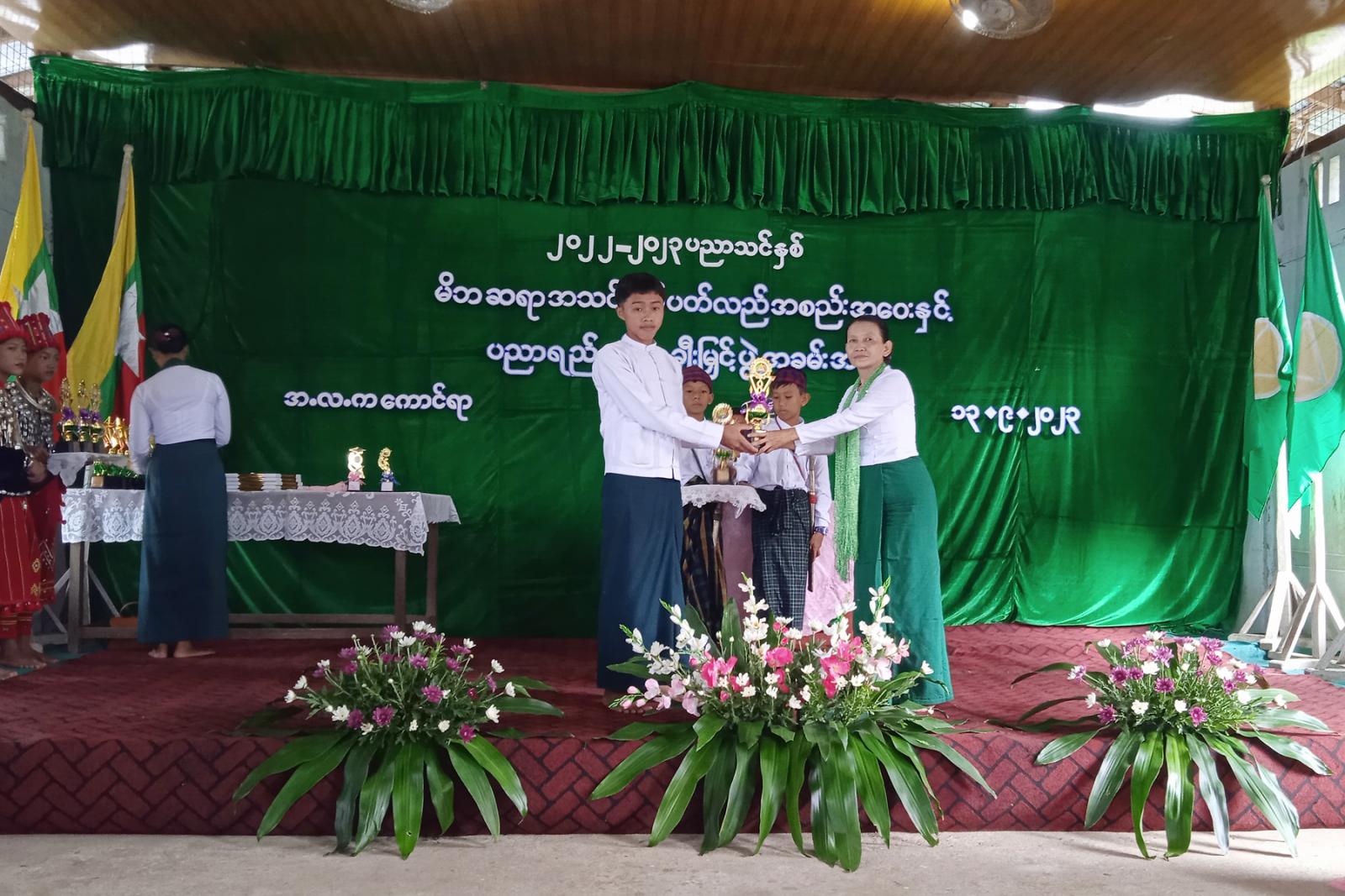 ဆက်လက်၍ သဘာပတိကြီးမှ ၂၀၂၃-၂၀၂၄ခုနှစ်၊ပညာသင်နှစ်အတွက်အမှုဆောင်သစ်များ ရွေးချယ်အတည်ပြု တင်မြောက်ခြင်းနှင့် ၂၀၂၂-၂၀၂၃ ခုနှစ်၊ ပညာသင်နှစ်အတွင်း ထူးချွန်ဆုရရှိသူ ကျောင်းသား/သူ (၃၉)ဦးနှင့် ကျောင်းတွင်လိုအပ်သည့် ဝေယျာဝစ္စ အသီးသီးအား လှူဒါန်းပေးကြသည့် အလှူရှင်များနှင့် ထူးချွန်ဆရာ ဆရာမများအား ဂုဏ်ပြုဆုများကို သက်ဆိုင်ရာ တာဝန်ရှိသူများက ဆုများ အသီးသီး ချီးမြှင့်ပေးအပ်ခဲ့ကြပြီး ကျောင်းသား/သူလေးများ၏ “ ဘယ်ပန်းချီရေးလို့မမှီ တယော