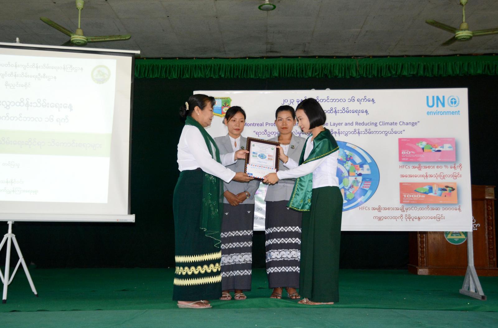 ကချင်ပြည်နယ်၊ မိုးညှင်းခရိုင်၊ မိုးညှင်းမြို့တွင် ၂၀၂၃ ခုနှစ် ကမ္ဘာ့အိုဇုန်းလွှာထိန်းသိမ်းရေးနေ့အထိမ်းအမှတ်နှင့် ဆုရရှိသူများအား ဆုများချီးမြှင့်ခြင်းအခမ်းအနားကို ယမန်နေ့နံနက်(၉)နာရီခွဲက အမှတ်(၃)အခြေခံပညာအထက်တန်းကျောင်း ရတနာခန်းမ၌ ကျင်းပသည်။