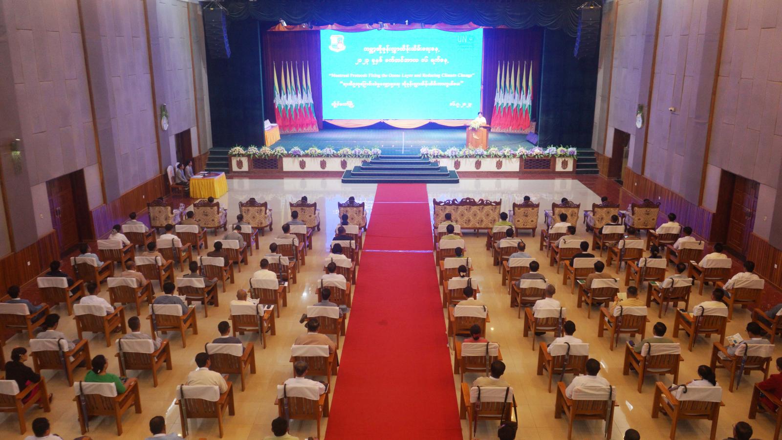 ရှေးဦးစွာ ကယားပြည်နယ်အစိုးရအဖွဲ့၊ ပြည်နယ်ဝန်ကြီးချုပ်ကိုယ်စား ပြည်နယ်စီးပွားရေးရာဝန်ကြီး ဦးစိန်ဦးက အဖွင့်အမှာစကားပြောကြားရာတွင် ယနေ့အခမ်းအနားကို ပြည်နယ်အတွင်း နေထိုင်ကြသည့် ဒေသနေပြည်သူများ ပတ်ဝန်းကျင် ထိန်းသိမ်းရေး အသိပညာများရရှိစေရန် ရည်ရွယ်ကျင်းပရခြင်းဖြစ်ကြောင်း၊ ယခုနှစ် ကမ္ဘာ့အိုဇုန်းလွှာ ထိန်းသိမ်းရေးနေ့ ဆောင်ပုဒ်မှာ "ရာသီဥတုပြောင်းလဲမှု လျှော့ချရေး အိုဇုန်းလွှာထိန်းသိမ်းကာကွယ်ပေး" (Montreal Protocol: Fixing the Ozone Layer and Reducing Climate Change) ဖြစ်ကြောင်း၊ အိုဇုန်းလွှာထိန်းသိမ်းရေးနှင့် ရာသီဥတုပြောင်းလဲမှု လျှော့ချရေးအတွက် ရိုးရှင်းထိရောက်သော နည်းလမ်းများကို လိုက်နာကျင့်သုံး ကြရမည်ဖြစ်ကြောင်း၊ အနာဂတ်မျိုးဆက်သစ်များအား ကောင်းမွန်သည့် သဘာဝပတ်ဝန်းကျင်ကို လက်ဆင့်ကမ်းပေးနိုင်ရန် အိုဇုန်းလွှာထိန်းသိမ်းကာကွယ်ခြင်းနှင့်အတူ ရာသီဥတုပြောင်းလဲမှု လျှော့ချခြင်းလုပ်ငန်းစဉ်များတွင် ဌာနဆိုင်ရာများ၊ အဖွဲ့အစည်းများ၊ လုပ်ငန်းရှင်များ၊ သုတေသနပညာရှင်များနှင့် ပြည်သူလူထုတစ်ရပ်လုံးက ပူးပေါင်းပါဝင် ဆောင်ရွက်ပေးကြစေလိုကြောင်း ပြောကြားခဲ့သည်။