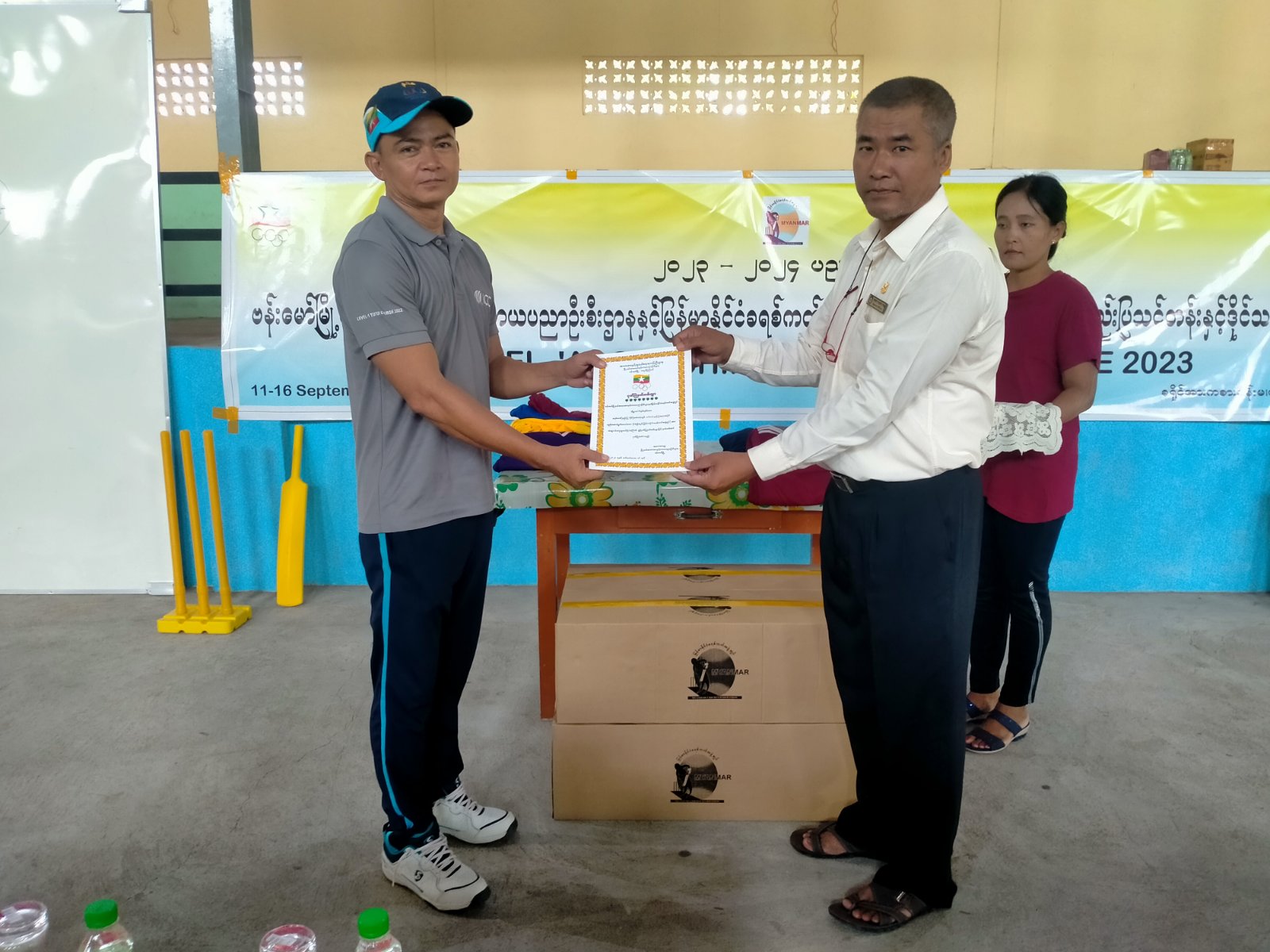 ယင်းနောက်ခရိုင်အားကစားနှင့်ကာယပညာဦးစီးဌာနမှ လက်ထောက်ညွှန်ကြားရေးမှူး ဦးကြည်စိုး၊ ခရိုင်သတ္တုဦးစီးမှူးဦးတင်ကိုကို၊ နယ်စပ်ဒေသတိုင်းရင်းသားလူငယ်များဖွံ့ဖြိုးရေး သင်တန်းကျောင်းကျောင်းအုပ်ကြီးဦးလောင်းထန်၊ မြို့နယ်စိုက်ပျိုးရေးဦးစီးမှူးဦးကျော်စိုးအောင်၊ မြို့နယ်အားကစားမှူးဦးသက်ပိုင်ထွန်းတို့က သင်တန်းနည်းပြဆရာများအား ဂုဏ်ပြုမှတ်တမ်းလွှာပေးအပ်ခြင်း၊ သင်တန်းသားများအား သင်တန်းဆင်းလက်မှတ်ပေးအပ်ခြင်း၊ အားကစားဝတ်စုံများထောက်ပံ့ပေးအပ်ခြင်း၊ နည်းပြဆရာများအား လက်ဆောင်ပေးအပ်ခြင်းများ ပြုလုပ်ခဲ့သည်။