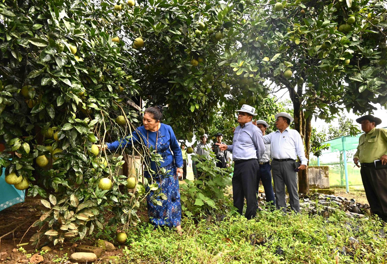 ထို့နောက် အဆိုပါ ပြည်ထောင်စုလမ်းမဘေးရှိ စိုက်ပျိုးရေးဦးစီးဌာနပိုင် မတ်ပန်ခြံ၌ ကျွဲကောသီးပင်များ စိုက်ပျိုးဖြစ်ထွန်းမှု၊ ဂရိတ်ဖုကိုင်းဆက်မျိုးပွား ဆောင်ရွက်ထားရှိသည့် ပျိုးပင်များ ပျိုးထောင်စိုက်ပျိုးထားရှိမှုတို့ကို ကြည့်ရှုစစ်ဆေးခဲ့ကြပြီး ဂရိတ်ဖုပျိုးပင်များ ဖြန့်ဝေဆောင်ရွက်နိုင်မှု အခြေအနေများကို မေးမြန်းဆွေးနွေးကာ ခြံစိုက်တောင်သူများအပြင် ဒေသခံများ၏ ခြံဝင်းများတွင် စိုက်ပျိုးဆောင်ရွက်နိုင်ရေး တိုးချဲ့ပျိုးထောင်ထားရှိရန် တာဝန်ရှိသူများအား မှာကြားခဲ့သည်။