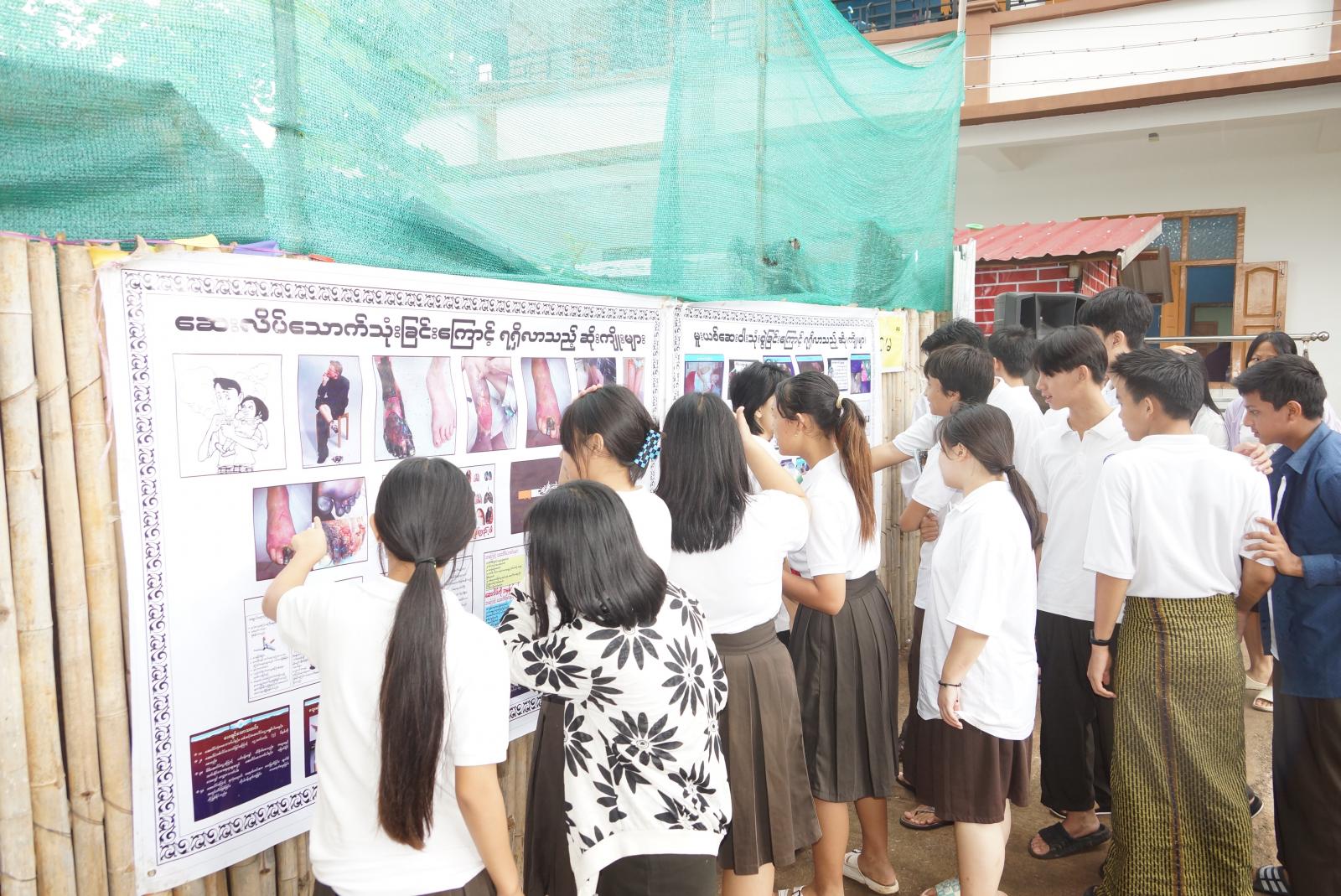 ယင်းနောက် တက်ရောက်လာကြသည့် ကျောင်းသား/သူများ ဆရာမများမှ ခရိုင်ပြန်ကြားရေးနှင့် ပြည်သူ့ဆက်ဆံရေးဦးစီးဌာနမှ ခင်းကျင်းပြသထားသည့် အသိပညာပေးနံရံကပ်စာစောင်နှင့် စာအုပ်၊ စာစောင်များကို စိတ်ပါဝင်စားစွာ ဖတ်ရှု့လေ့လာခဲ့ကြသည်။