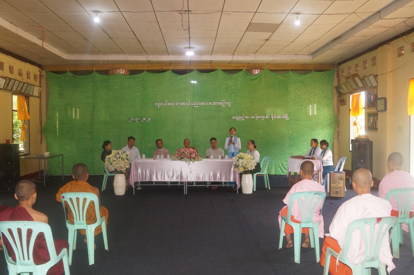 ရှေးဦးစွာ သဗ္ဗညုကျောင်းတိုက်ဆရာတော် မဟာသဒ္ဓမ္မဇောတိကဓဇဘွဲ့တံဆိပ်တော်ရ ဘဒ္ဒန္တဣန္ဒက က ရှင်သာမဏေများ၊ သီလရှင်များနှင့် ကျောင်းသား၊ ကျောင်းသူများအား ဆုံးမဩဝါဒစကား မိန့်ကြားတော်မူခဲ့ပြီး ပြန်ကြားရေးနှင့်ပြည်သူ့ဆက်ဆံရေးဦးစီးဌာန၊ မိုင်းဆတ်ခရိုင်ရုံးမှ လက်ထောက်ညွှန်ကြားရေးမှူး ဒေါ်မျိုးမျိုးသွယ်က လူငယ်ရေးရာအသိပညာပေး ဟောပြောပွဲကျင်းပရခြင်း ရည်ရွယ်ချက်နှင့် “လူငယ်နှင့် မူးယစ်ဆေးဝါး” ခေါင်းစဉ်ဖြင့် အသိပညာပေး ဟောပြောခဲ့သည်။