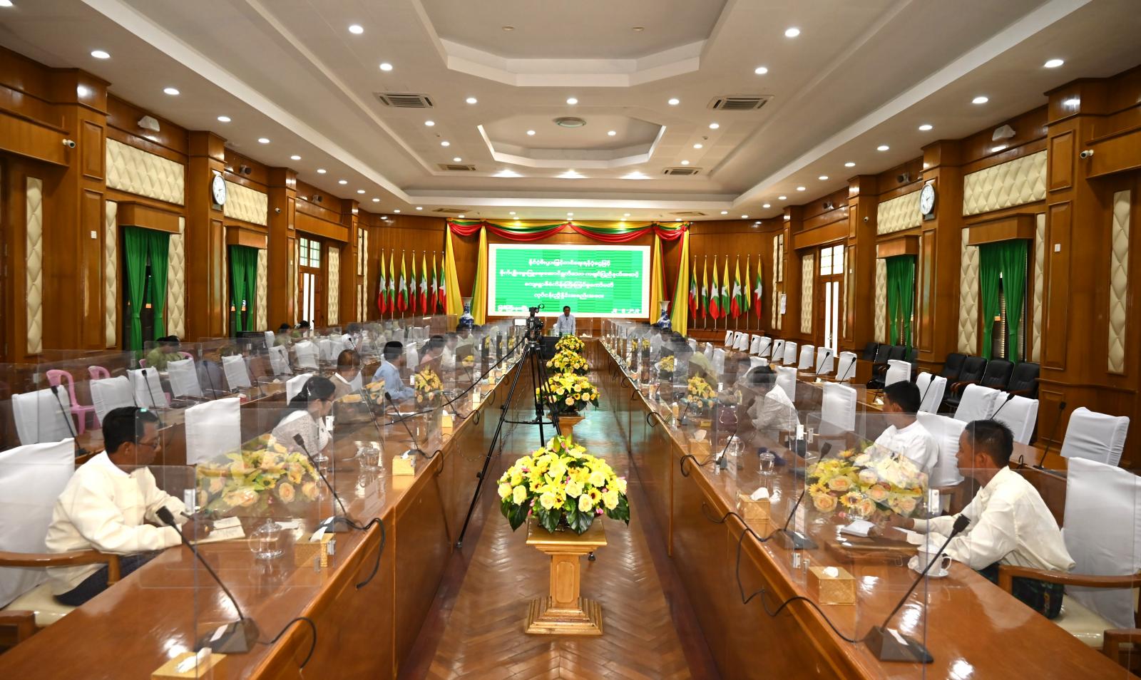 ကချင်ပြည်နယ်အတွင်း နိုင်ငံ့စီးပွားမြှင့်တင်ရေး ရန်ပုံငွေကျပ် ၈ ဘီလီယံဖြင့် ရင်းနှီးမတည်ပေးထားသည့် စိုက်ပျိုးမွေးမြူရေးနှင့် ကုန်ထုတ်လုပ်မှုလုပ်ငန်းများမှ ပြန်လည်ပေးသွင်းသည့် ပထမ(၆)လအတိုးရငွေဖြင့် ဒေသတွင်းစားရေရိက္ခာဖူလုံစေရေးနှင့် ကုန်ထုတ်လုပ်မှုများ တိုးတက်မြင့်မားလာစေရေး ကဏ္ဍအလိုက်လုပ်ငန်းများတိုးချဲ့၍ ရင်းနှီးမတည်ပေးနိုင်ရေး ပြည်နယ်ဝန်ကြီးချုပ်သည် ပြည်နယ်အဆင့် ကျေးရွာစီမံကိန်းကြီးကြပ်မှုကော်မတီအဖွဲ့ဝင်များနှင့် ယမန်နေ့မွန်းလွဲ ၂ နာရီက ပြည်နယ်အစိုးရအဖွဲ့ရုံး မလိခခန်းမ၌ လုပ်ငန်းညှိနှိုင်းဆွေးနွေးခဲ့ကြသည်။
