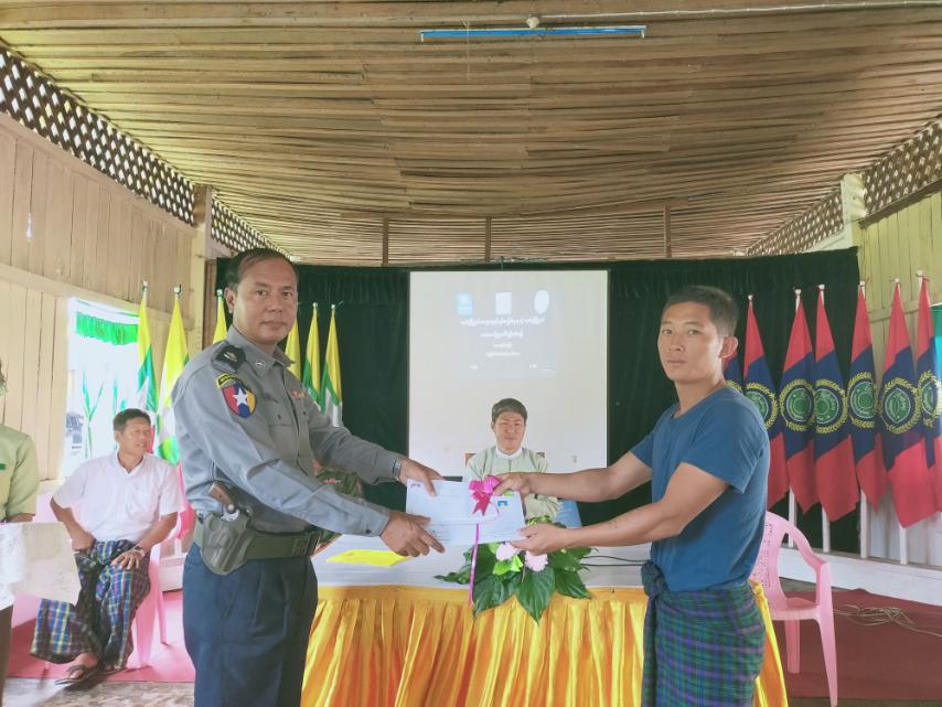 ထို့နောက် သင်တန်းတွင် ထူးချွန်စွာအောင်မြင်ခဲ့သော သင်တန်းသားနှစ်ဦးအား မြို့နယ်စီမံအုပ်ချုပ်ရေးအဖွဲ့ဥက္ကဋ္ဌ ဦးနမ်ရဲမင်က ဂုဏ်ပြုဆုနှင့် သင်တန်းဆင်းလက်မှတ်ပေးအပ်ခဲ့ပြီး သင်တန်းနည်းပြနှင့် ကျန်သင်တန်းသားများအား မြို့နယ်စီမံအုပ်ချုပ်ရေးအဖွဲ့ဝင်များက ဂုဏ်ပြုငွေနှင့် သင်တန်းဆင်းလက်မှတ်များ အသီးသီး ပေးအပ်ခဲ့ကြသည်။