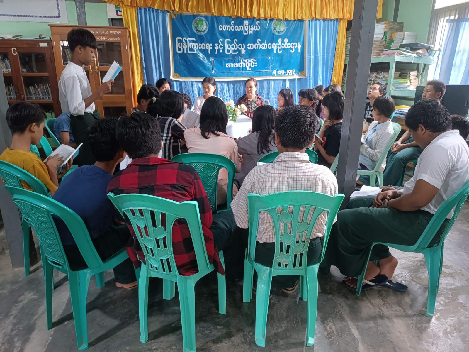 စာဖတ်ဝိုင်းတွင် ပြန်ကြားရေးနှင့်ပြည်သူ့ဆက်ဆံရေးဦးစီးဌာနမှ ဒုတိယဦးစီးမှူး ဒေါ်သိမ့်သိမ့်အေးက စာဖတ်ဝိုင်းပြုလုပ်ရခြင်း ရည်ရွယ်ချက်ကိုပြောကြားပြီး အ.လ.က(အနောက်ရပ်) ကျောင်းမှ Grade-8 ကျောင်းသား မောင်ရဲဘုန်းမာန်က စာရေးဆရာ ဒေါက်တာခင်မောင်ညို ရေးသားသော လူငယ်နှင့် အကောင်းဆုံးသောဘဝကို တည်ဆောက်ခြင်း စာအုပ်မှ လူငယ်နှင့်အမှား ခေါင်းစဉ်ကိုဆွေးနွေးရာ အမှားဖြစ်မှာကြောက်၍ ဘာမှမလုပ်ဘဲ မနေရန်၊ အမှားလုပ်မိရင်လျှင်လည်း ဝန်ခံရန်နှင့် အမှားကိုဝန်ခံခြင်းသည် အရေးပါဆုံးသော သိက္ခာရှိသည့် လုပ်ရပ်တစ်ခုဖြစ်ပုံ၊ အောင်မြင်မှုတွေအားလုံးသည် အမှားကရသည့်သင်ခန်းစာများနှင့် တည်ဆောက်ထားပုံ၊ အမှားလုပ်မိပြီး ဝန်ခံခြင်းမရှိပါက အရှုံးများကို လက်ခံရရှိပုံတို့ကို လည်းကောင်း၊ အ.လ.က(အနောက်ရပ်)ကျောင်းမှ Grade-8 ကျောင်းသူ မခိုင်ဇင်သော်က လူငယ်နှင့်တာဝန်သိမှု ခေါင်းစဉ်မှ လူများသည် တစ်ဦးတည်းနေထိုင်လို့မရပုံ၊ အခြားသူတွေအတွက်သာမက မိမိကိုယ်ကိုလည်း အကျိုးပြုကာ နေထိုင်ကြရပုံ၊ အနစ်နာခံတတ်သူများသည် လူ့လောကကောင်းမွန်တိုးတက်စေဖို့အတွက် လုပ်နေကြသူများဖြစ်ပုံ၊ တာဝန်သိသည်နှင့် တာဝန်ယူမှုတွေများပုံ၊ တာဝန်ကျေအောင် ဆောင်ရွက်ရပုံနှင့် ရိုးသားမှုကို အခြေခံဆောင်ရွက်ရပုံတို့ကိုလည်းကောင် အသီးသီး ဆွေးနွေးခဲ့ကြသည်။