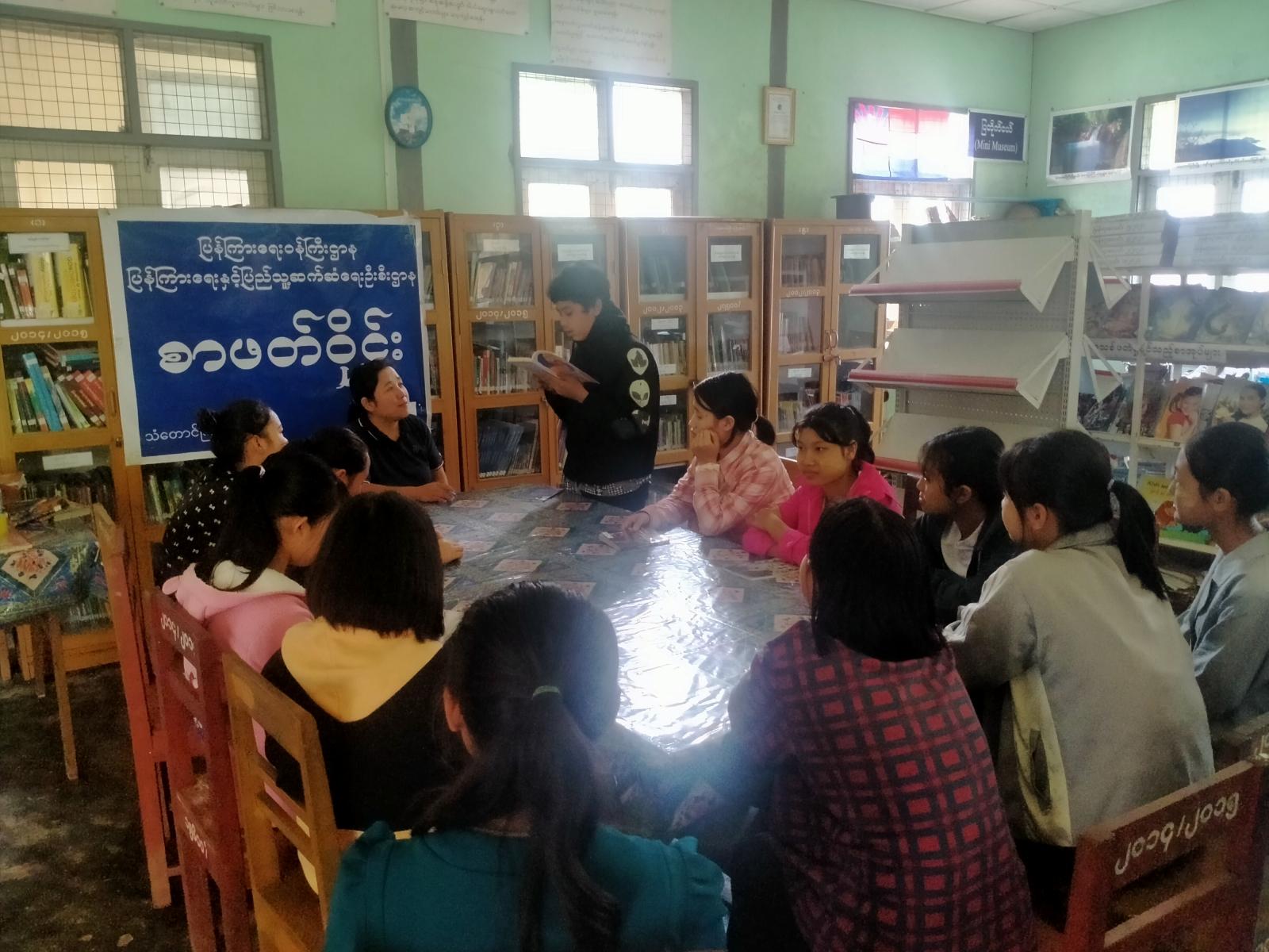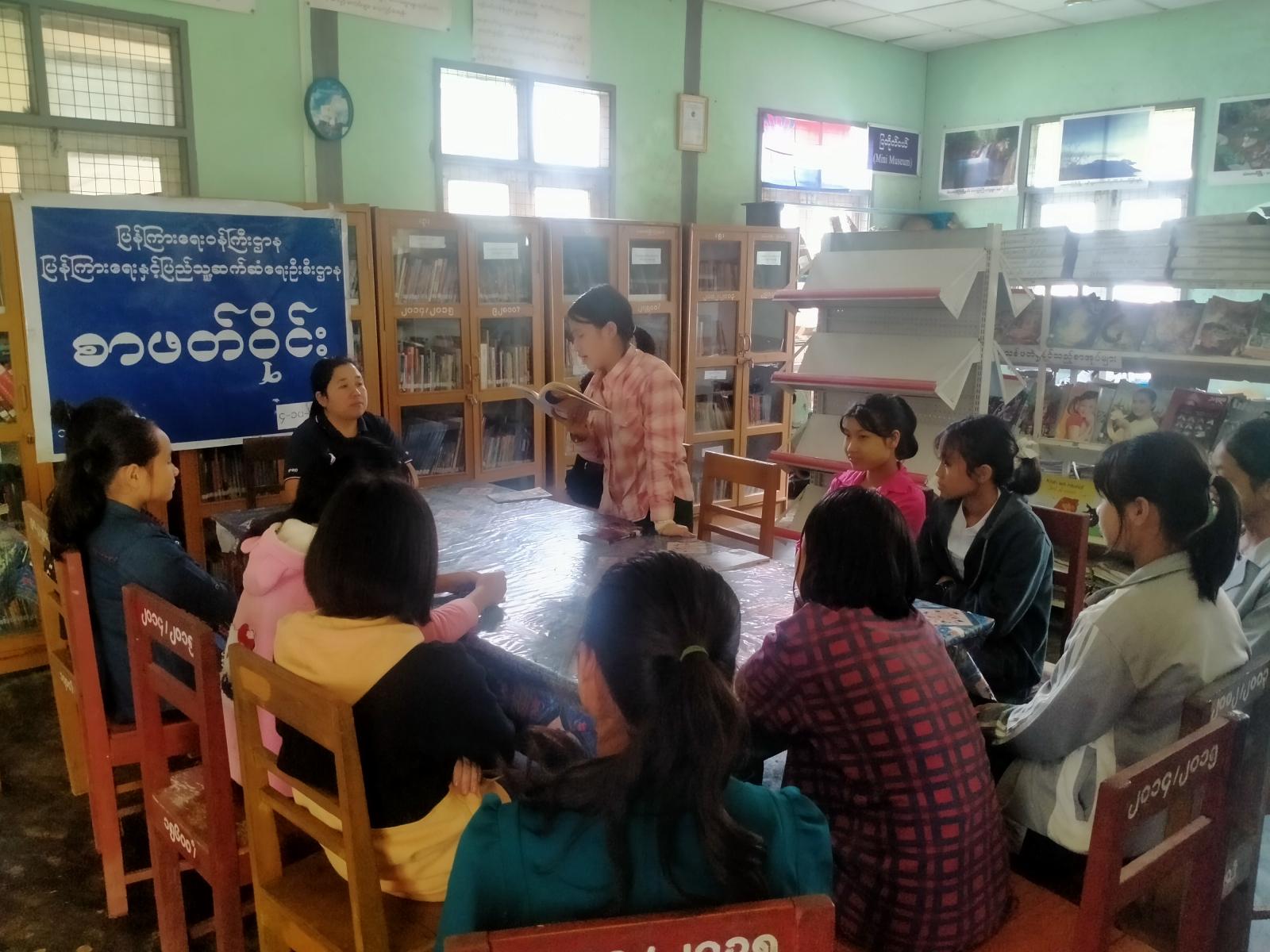 ကရင်ပြည်နယ်၊ သံတောင်ကြီးမြို့နယ်တွင် စာဖတ်ခြင်းအကျိုးကျေးဇူးသိရှိစေရန် ရည်ရွယ်၍ Book Club/Youth Club အဖွဲ့ဝင်များက စာရေးဆရာမောင်မင်းစိုး၏လူငယ်နှင့်အပြောင်းအလဲစာအုပ်အား ယနေ့နံနက် (၁၀) နာရီ အချိန်က Community Centre ခန်းမ၌ စာဖတ်ဝိုင်း ဆွေးနွေး ဆောင်ရွက်ခဲ့ကြောင်း သိရသည်။