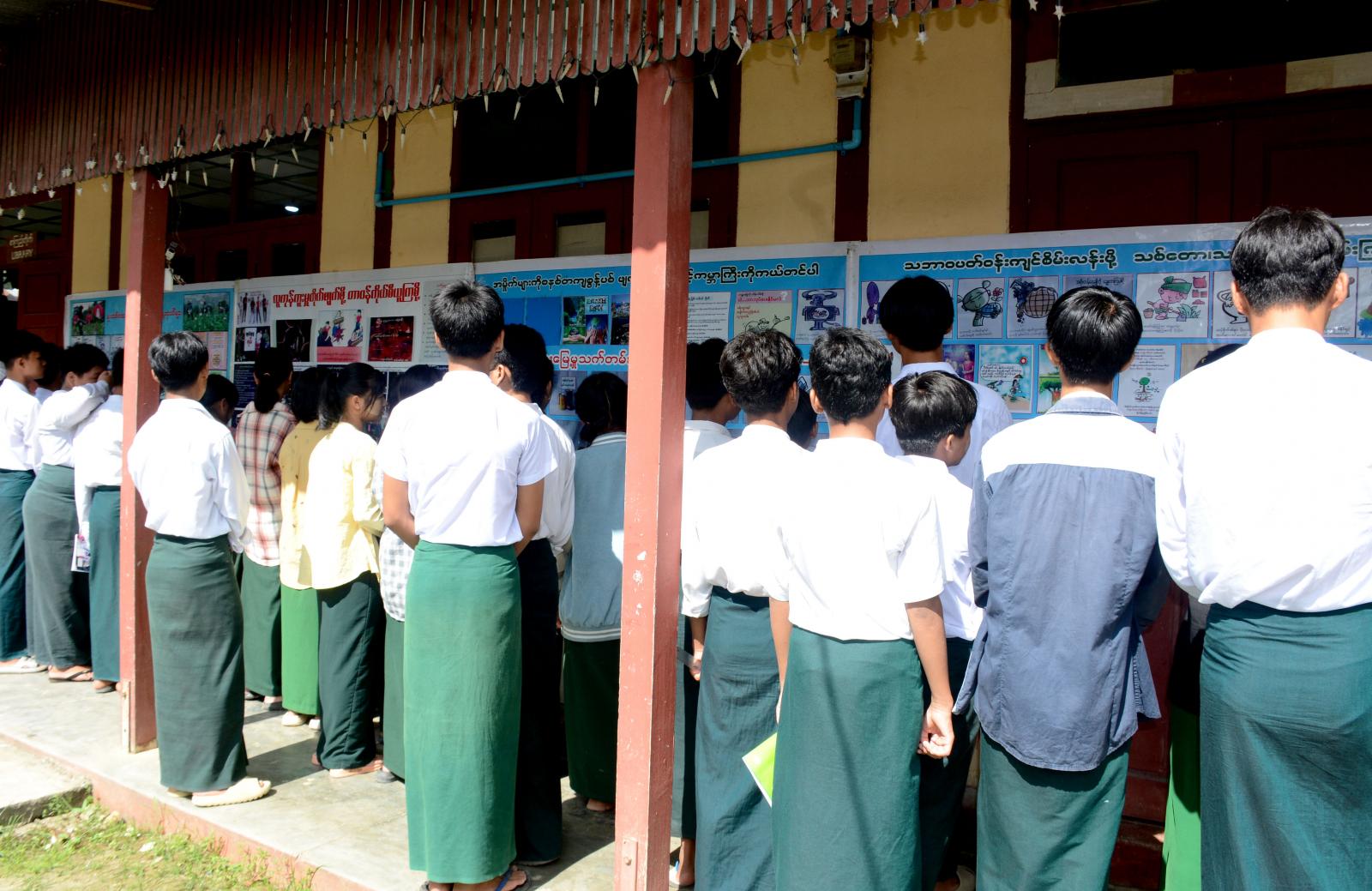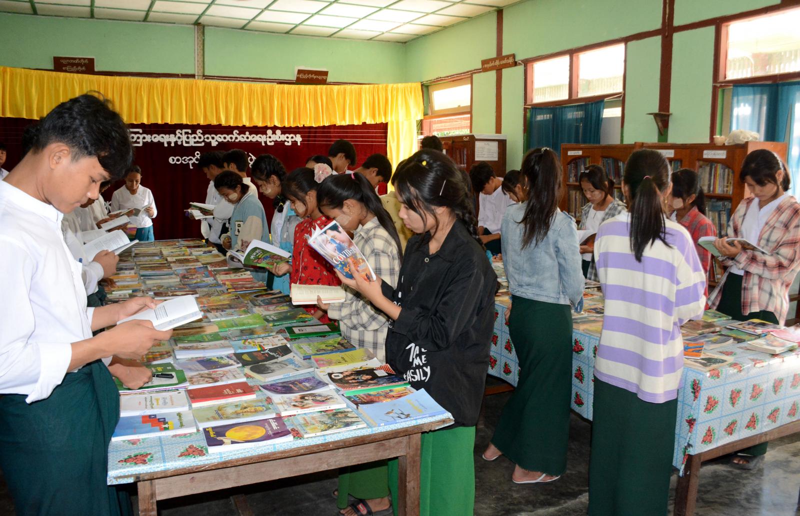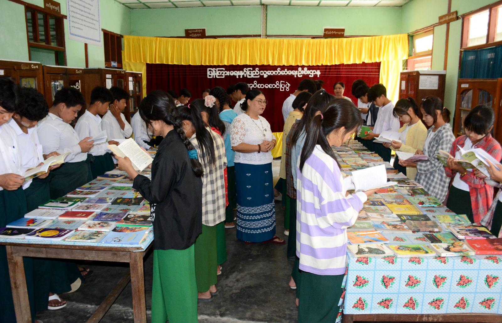ထို့နောက် အဆိုပါခန်းမတွင် ခင်းကျင်းပြသထားသည့် သုတ ရသစာအုပ်ပေါင်း(၂၀၀)ကျော်နှင့် မူးယစ်ဆေးဝါးအန္တရာယ်အသိပညာပေး၊ လူကုန်ကူးမှုအန္တရာယ် တားဆီးကာကွယ်ရေးအသိပညာပေး၊ သဘာဝဘေးအန္တရာယ်ဆိုင်ရာအသိပညာပေးနှင့် သဘာဝပတ်ဝန်းကျင်းထိန်းသိမ်းရေးအသိပညာပေး နံရံကပ်စာစောင်များကို ခင်းကျင်းပြသရာ ကျောင်းသားကျောင်းသူများမှ စိတ်ပါဝင်စားစွာ လေ့လာကြည့်ရှုခဲ့ကြကြောင်း သိရသည်။