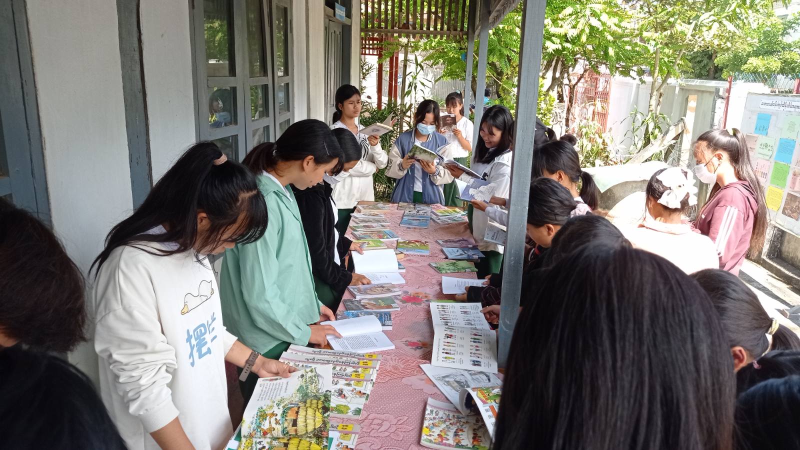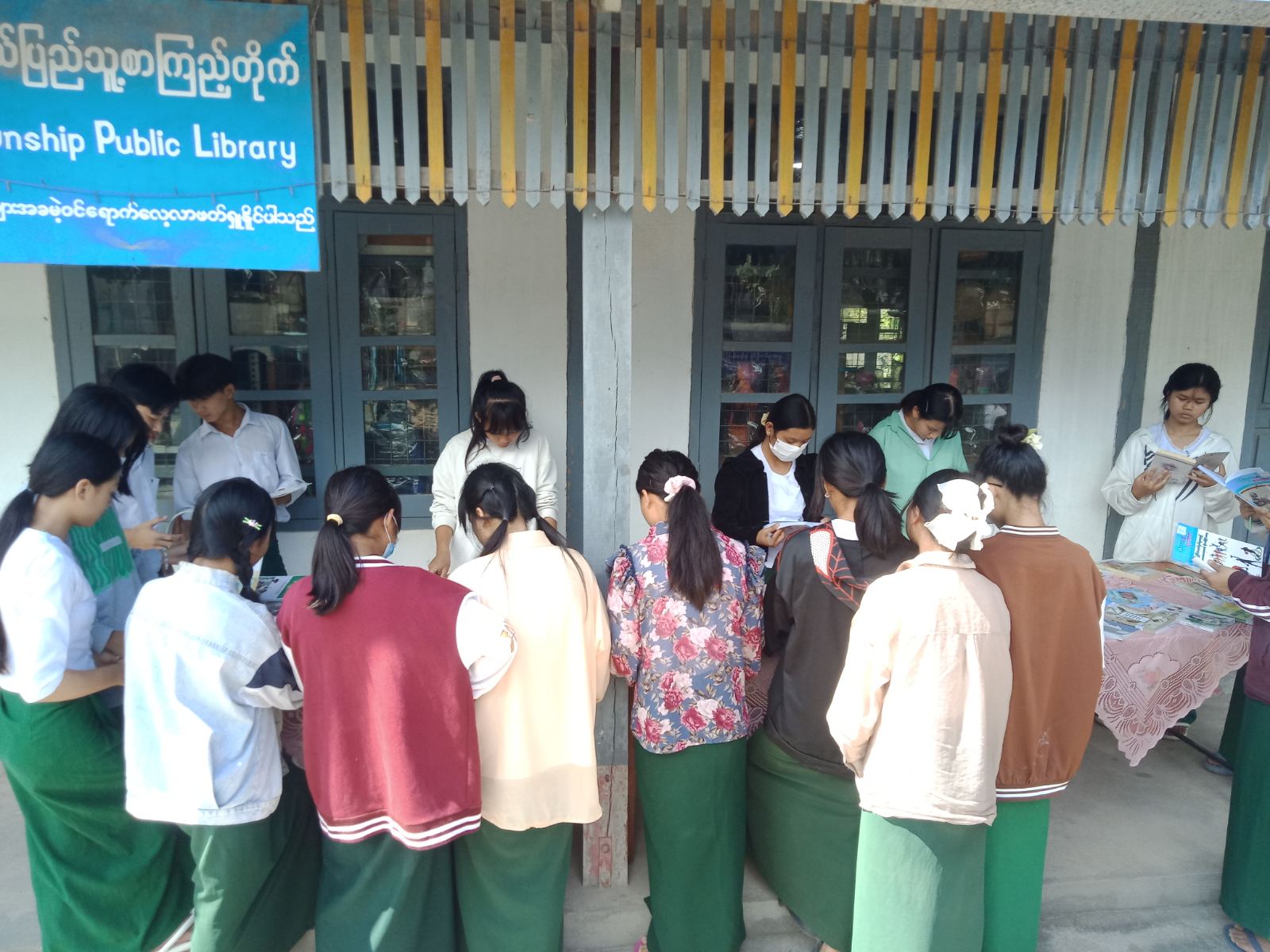 ဆက်လက်၍ ကျောင်းသား၊ ကျောင်းသူများ ဖတ်ရှုလေ့လာနိုင်ရန် သုတ/ရသစာပေများ၊ မဂ္ဂဇင်းများ၊ ရုပ်ပြပုံပြင်များ၊ ကလေးကဗျာများစသည့် ကလေးများ အသိပညာဗဟုသုတမြင့်မားတိုးတက်စေမည့် စာအုပ်စာပေများကို ခင်းကျင်းပြသထားရာ ကျောင်းသား၊ ကျောင်းသူများက စိတ်ဝင်စားစွာ ဖတ်ရှုလေ့လာခဲ့ကြောင်းနှင့် သိရှိလိုသည်များကို မေးမြန်းခဲ့ကြရာ ဝန်ထမ်းများက ပြန်လည်ဖြေကြားပေးခဲ့ကြကြောင်း သိရှိရပါသည်။