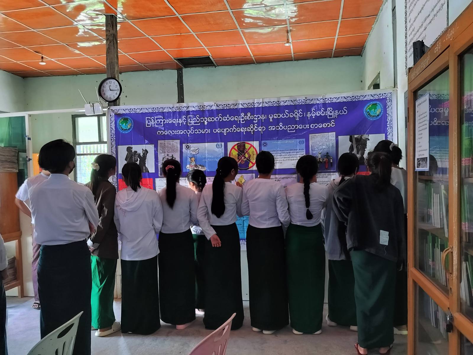ဆက်လက်၍ မြို့နယ်ပြန်ကြားရေးနှင့်ပြည်သူ့ဆက်ဆံရေးဦးစီးဌာနမှ ပြသထားသည့် မူးယစ်ဆေးဝါးအန္တရာယ် အသိပညာပေးနံရံကပ်စာစောင်နှင့် ကလေးအလုပ်သမားပပျောက်ရေးဆိုင်ရာ အသိပညာပေးနံရံကပ်စာစောင်တို့ကို ကျောင်းသား၊ ကျောင်းသူများမှ စိတ်ဝင်စားစွာ ကြည့်ရှုလေ့လာခဲ့ကြကြောင်း သိရသည်။