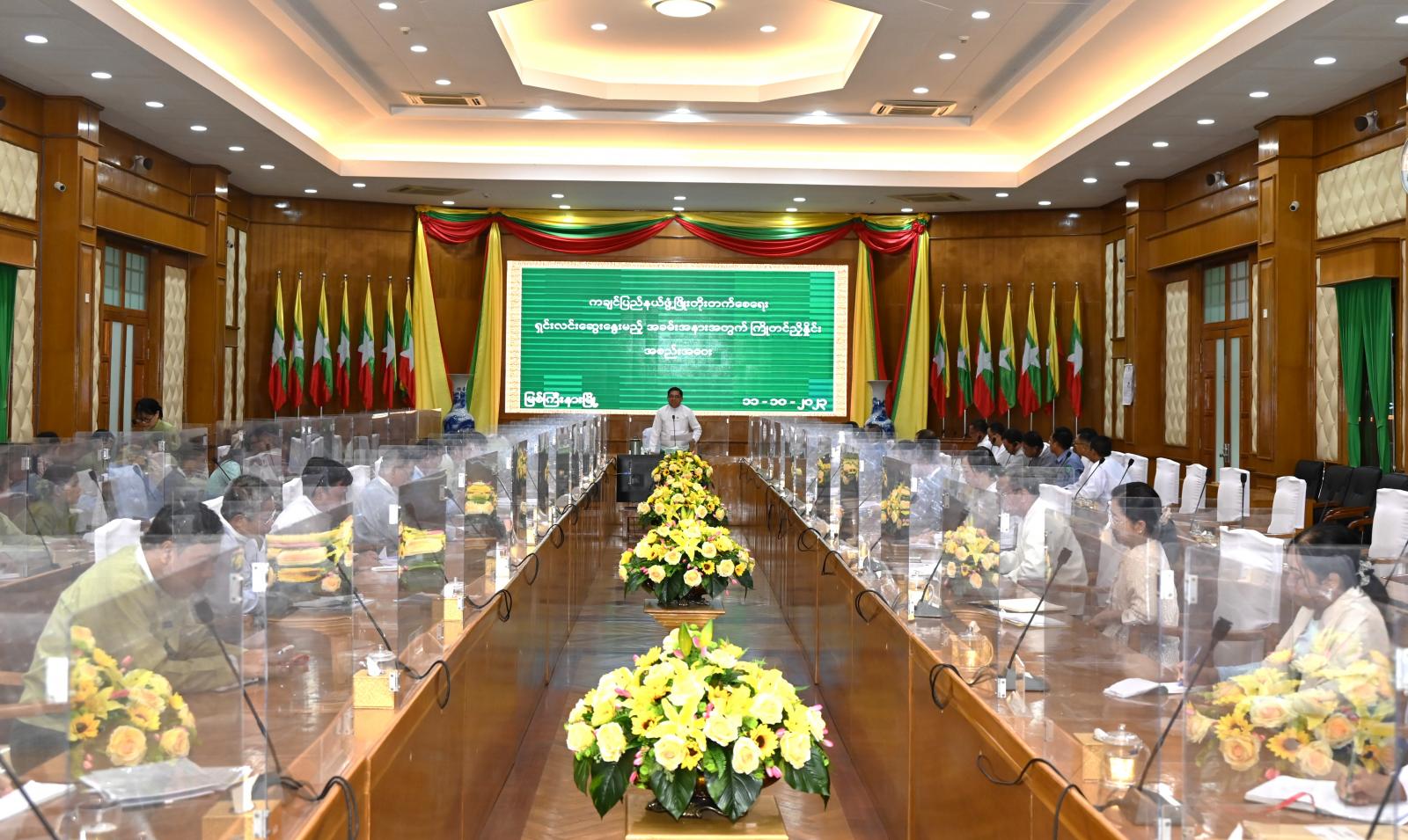 လုပ်ငန်းညှိနှိုင်းဆွေးနွေးရာတွင် ပြည်နယ်ဝန်ကြီးချုပ်က ပြည်နယ်ဖွံ့ဖြိုးတိုးတက်ရေးအတွက် စိုက်ပျိုးမွေးမြူရေးကို အခြေခံပြီး အရှိန်အဟုန်ဖြင့် တိုးတက်မြင့်မားအောင် အကောင်အထည်ဖော် ဆောင်ရွက်ရမည်ဖြစ်ကြောင်း၊ လက်ရှိအချိန်တွင် နိုင်ငံ့စီးပွားမြှင့်တင်ရေး ရန်ပုံငွေ ၈ ဘီလီယံလုံးကို ရင်းနှီးမတည်နိုင်ခဲ့ပြီး ပထမ(၆)လအတိုးရငွေများကိုလည်း အရှိန်အဟုန်မပျက် ပြန်လည် လည်ပတ် နိုင်ရေး မတည်ပေးလျက်ရှိကြောင်း၊ ထို့အပြင် MSME လုပ်ငန်းများ တိုးတက်မြှင့်မားရေးအတွက် အား ပေးမြှင့်တင်မှုကိုလည်း တိုးမြှင့်ဆောင်ရွက်ရန်လိုကြောင်း၊ ယခုနှစ်တွင် ပြည်နယ်အတွင်း မိုးစပါးစိုက် ဧက ၅ သိန်းကျော် တိုးမြှင့်လာမှုအပေါ် ပန်းတိုင်အထွက်နှုန်းရရှိရေးနှင့် မိုးစပါးရိတ်သိမ်းချိန် သီးထပ် သီးညှပ်များမြန်ဆန်စွာစိုက်ပျိုးနိုင်ရေး ချိတ်ဆက်စည်းရုံးဆောင်ရွက်သွားရေး၊ လိုအပ်သည့် သွင်းအား စုများ၊ စိုက်ပျိုးရေလိုအပ်ချက်များ ဖြည့်ဆည်းပေးနိုင်ရေးကိုလည်း စနစ်တကျကြိုတင်စီမံဆောင်ရွက် သွားရန်လိုကြောင်း၊ ဒေသဖွံ့ဖြိုးတိုးတက်ရေးအတွက် ပြည်သူများ၏ လူမှုစီးပွားဘဝတိုးတက်မြင့်မား ရေးကို မျှော်မှန်းပြီး ရှေ့လုပ်ငန်းစီမံကိန်းများအပေါ် သုံးသပ်ဆွေးနွေး အကောင်အထည်ဖော်ဆောင် ရွက်သွားရမည်ဖြစ်ကြောင်း တိုက်တွန်းမှာကြားသည်။