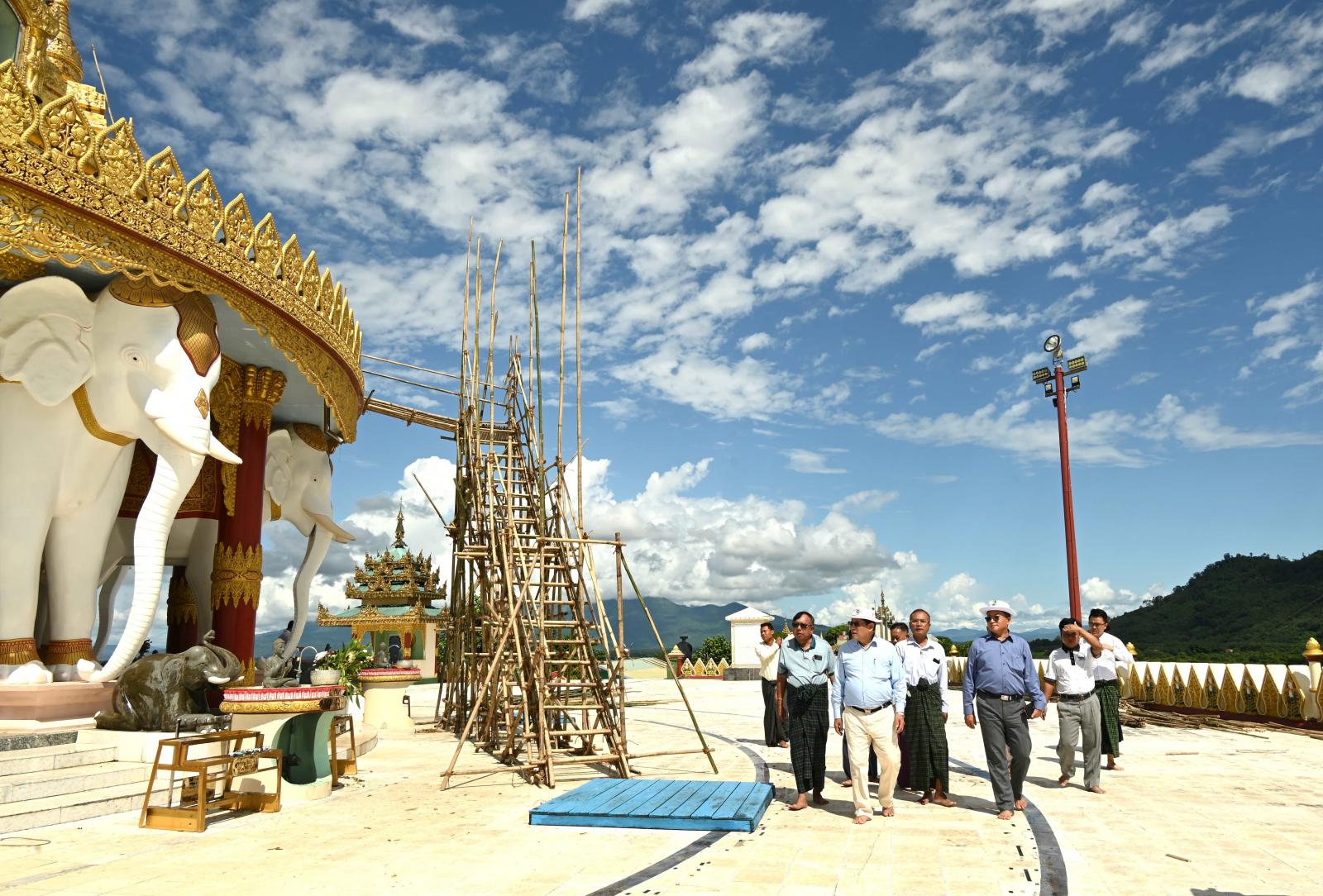 ထိုမှတစ်ဆင့် ပြည်နယ်ဝန်ကြီးများသည် တာဝန်ရှိသူများနှင့်အတူ ဝိုင်းမော်မြို့နယ် မိုင်းနားကျေးရွာအုပ်စုအတွင်းရှိ ရွှေမိုးတောင်ပေါ်တွင် တည်ထားကိုးကွယ်ထားသည့် ရဟန္တတစ်ထောင်ရှင်ပင်မြတ်စွာ ဆုတောင်းပြည့်စေတီတော်မြတ်ကြီးသို့ သွားရောက်ပြီး စေတီတော်ကြီး ရွှေစင်၊ ရွှေသား၊ ရွှေသင်္ကန်းကပ်လှူပူဇော်နိုင်ရေး ပြင်ဆင်ဆောင်ရွက်နေမှု အခြေအနေများကို လှည့်လည်ကြည့်ရှုစစ်ဆေးပြီး အလှူငွေရရှိမှုအခြေအနေများ၊ ရွှေဆိုင်းအသစ်များ မှာယူဆောင်ရွက်ထားရှိမှု အခြေအနေများကို ဆွေးနွေးညှိနှိုင်းခဲ့ကြပြီး ပြည်နယ်ဝန်ကြီးများက ကော်မတီအဖွဲ့ဝင်ဌာနဆိုင်ရာများ၊ မြို့နယ်စီမံအုပ်ချုပ်ရေးအဖွဲ့ဝင်များ၊ ဂေါပကများအကြား လိုအပ်သည်များကို ပေါင်းစပ်ဆောင်ရွက်ပေးခဲ့ကြသည်။