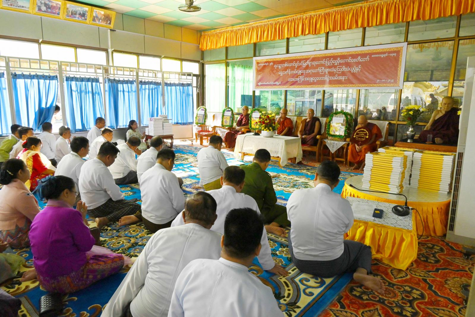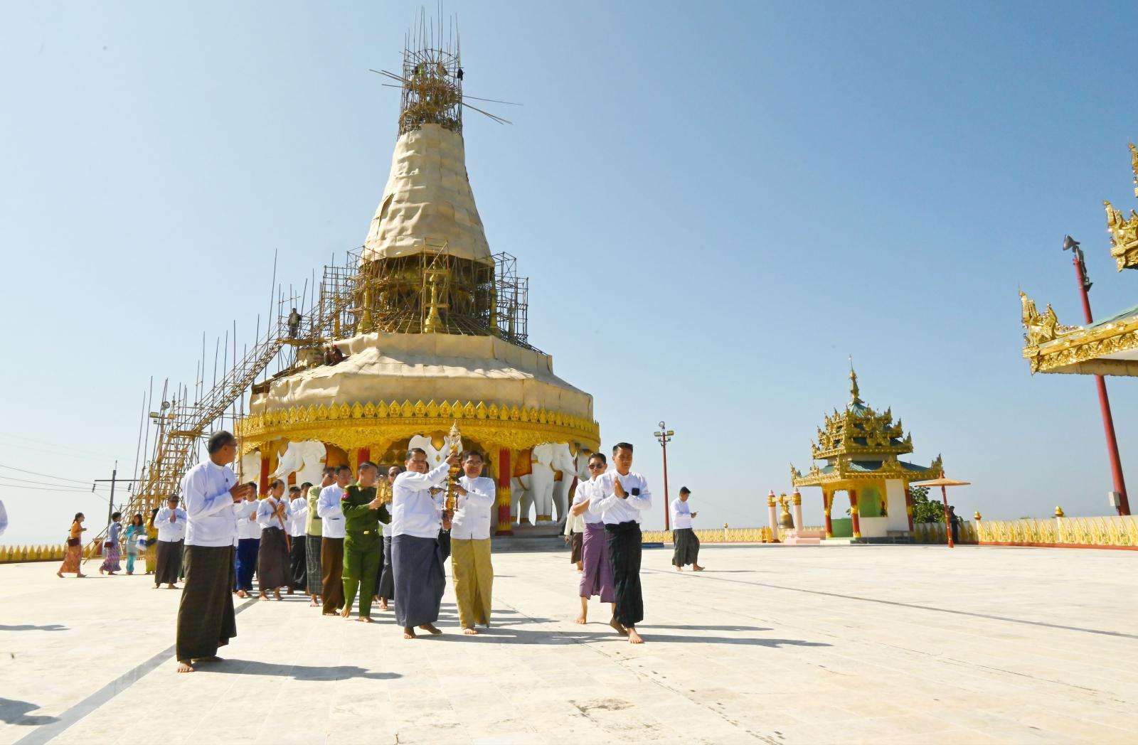ထို့နောက် ပြည်နယ်ဝန်ကြီးချုပ်နှင့် အဖွဲ့ဝင်များသည် စေတီတော်ကြီး ရွှေသင်္ကန်းကပ်လှူနိုင်ရေး ဆောင်ရွက်ထားရှိမှုအခြေအနေများကို ကြည့်ရှုစစ်ဆေးခဲ့ကြပြီး ပြည်နယ်ဝန်ကြီးချုပ်က စေတီတော် အထွဋ်တင်လှူပူဇော်ထားသည့် စိန်ဖူးတော်၊ ငှက်မျက်နားတော်တို့အား ရှင်းလင်းဆောင်၌ ယာယီပူဇော်ထားရှိရေး ပင့်ဆောင်ပေးခဲ့ကြသည်။