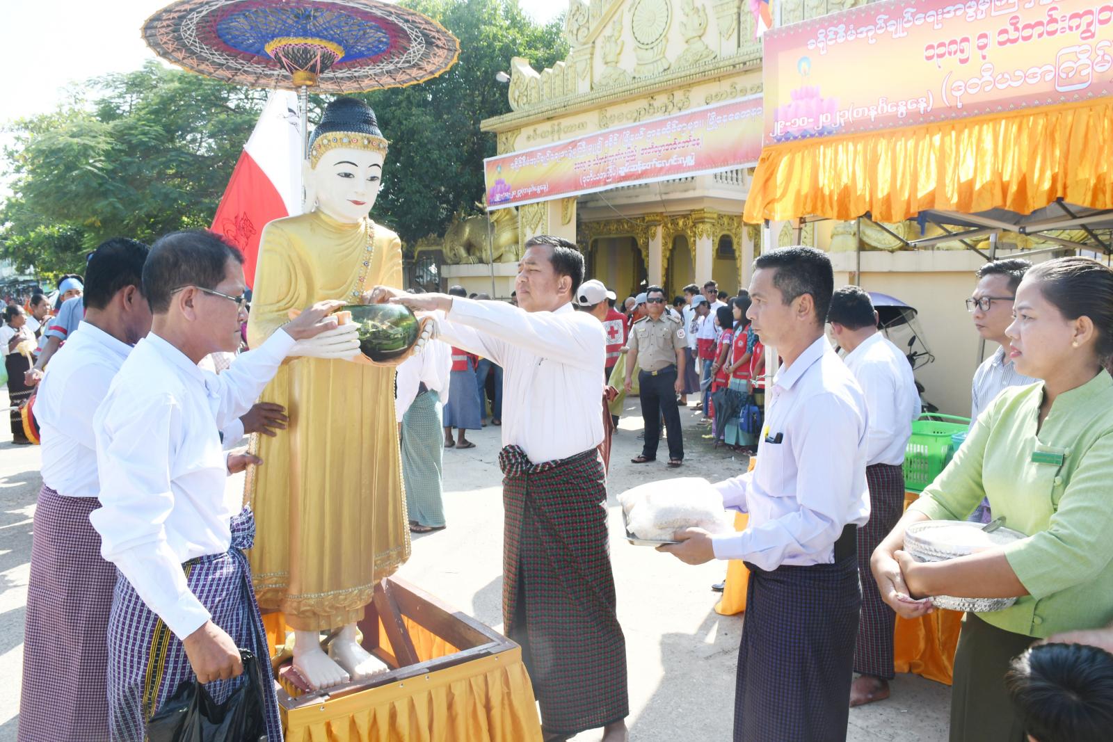 ထိုသို့ ဆွမ်းဆန်စိမ်းလောင်းလှူရာတွင် ခရိုင်စီမံအုပ်ချုပ်ရေးအဖွဲ့မှကြီးမှူး၍ ခရိုင်/မြို့နယ်အဆင့် ဌာနဆိုင်ရာများ၊ မြို့နေစေတနာရှင်များ၏ ဒုတိယအကြိမ်မြောက် ရခိုင်ရိုးရာအစဉ်အလာအတိုင်း စုပေါင်းဆွမ်းဆန်တော်လောင်းလှူပွဲကို ကျင်းပပြုလုပ်ရာ ရဟန်း၊ သံဃာတော်အရှင်သူမြတ်များအား မြို့မဘုန်းတော်ကြီးကျောင်းတိုက်မှ စတင်ထွက်ခွာကာ ဈေးကြီးတစ်ပတ်လမ်းမကြီးအတိုင်း စီတန်းလည့်လည်ကာ ရဟန်း၊ သံဃာတော်အပါး(၁၄၀)ခန့်အား ဆွမ်းဆန်စိမ်းနှင့် လှူဖွယ်ဝတ္ထုပစ္စည်းများအား စည်းကားသိုက်မြိုက်စွာ လောင်းလှူခဲ့ကြောင်းသိရသည်။