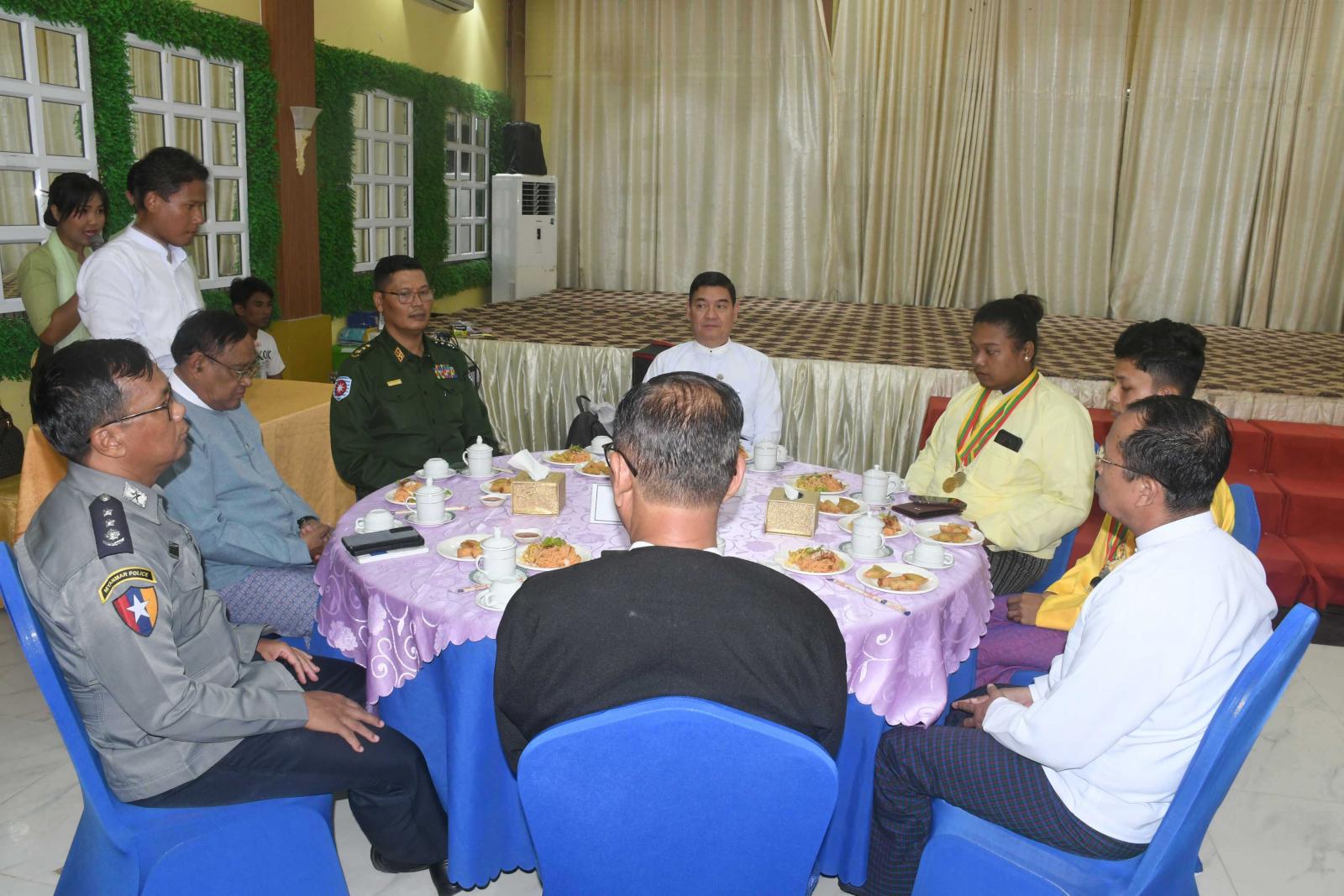 ယင်းနောက် ပြည်နယ်ဝန်ကြီးချုပ်နှင့် ဇနီးတာဝန်ရှိသူများက ပြိုင်ပွဲဝင်များနှင့်နည်းပြများ၊ အုပ်ချုပ်သူများအား ရင်းရင်းနှီးနှီးလိုက်လံနှုတ်ဆက်ကြသည်။
