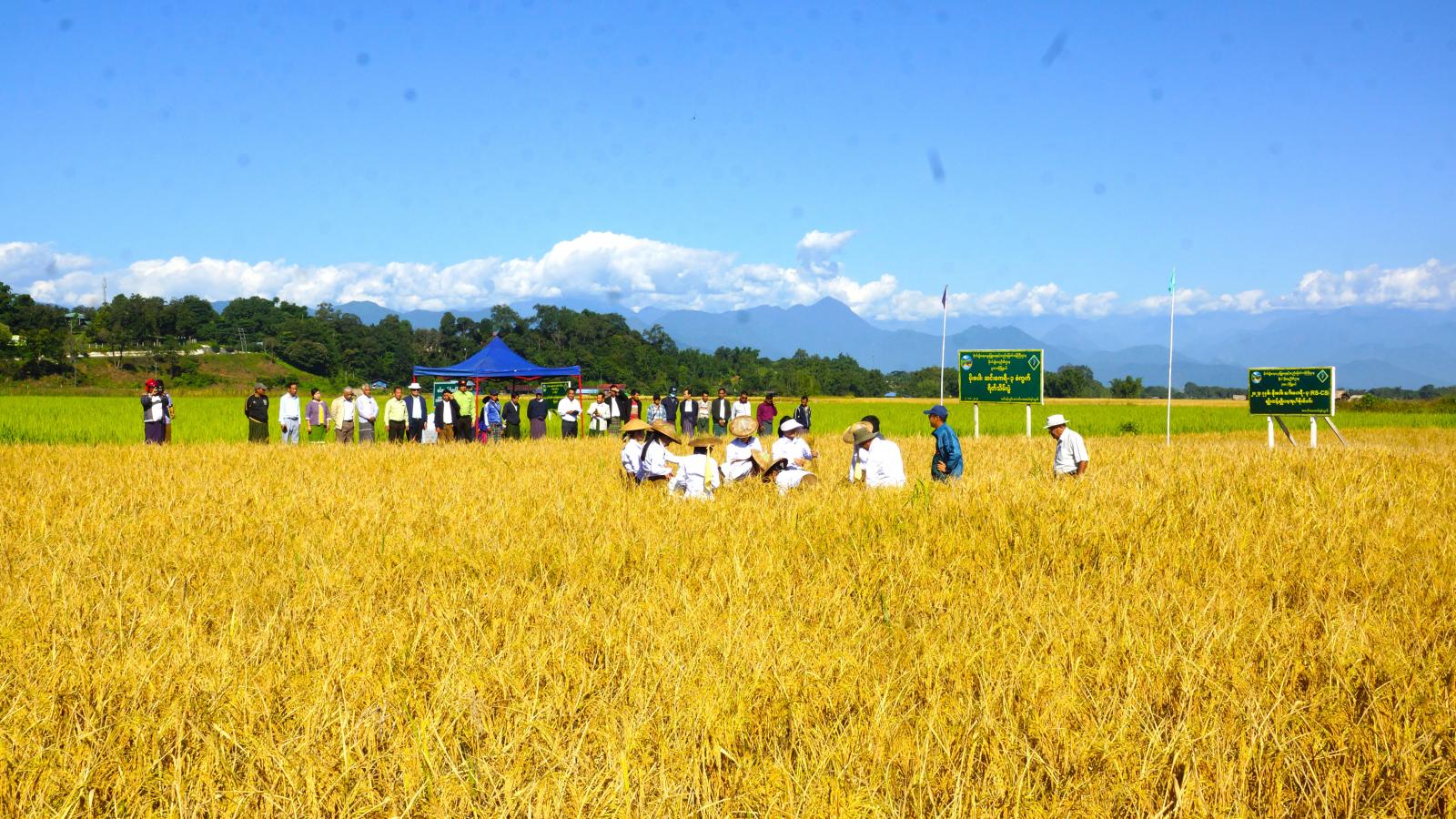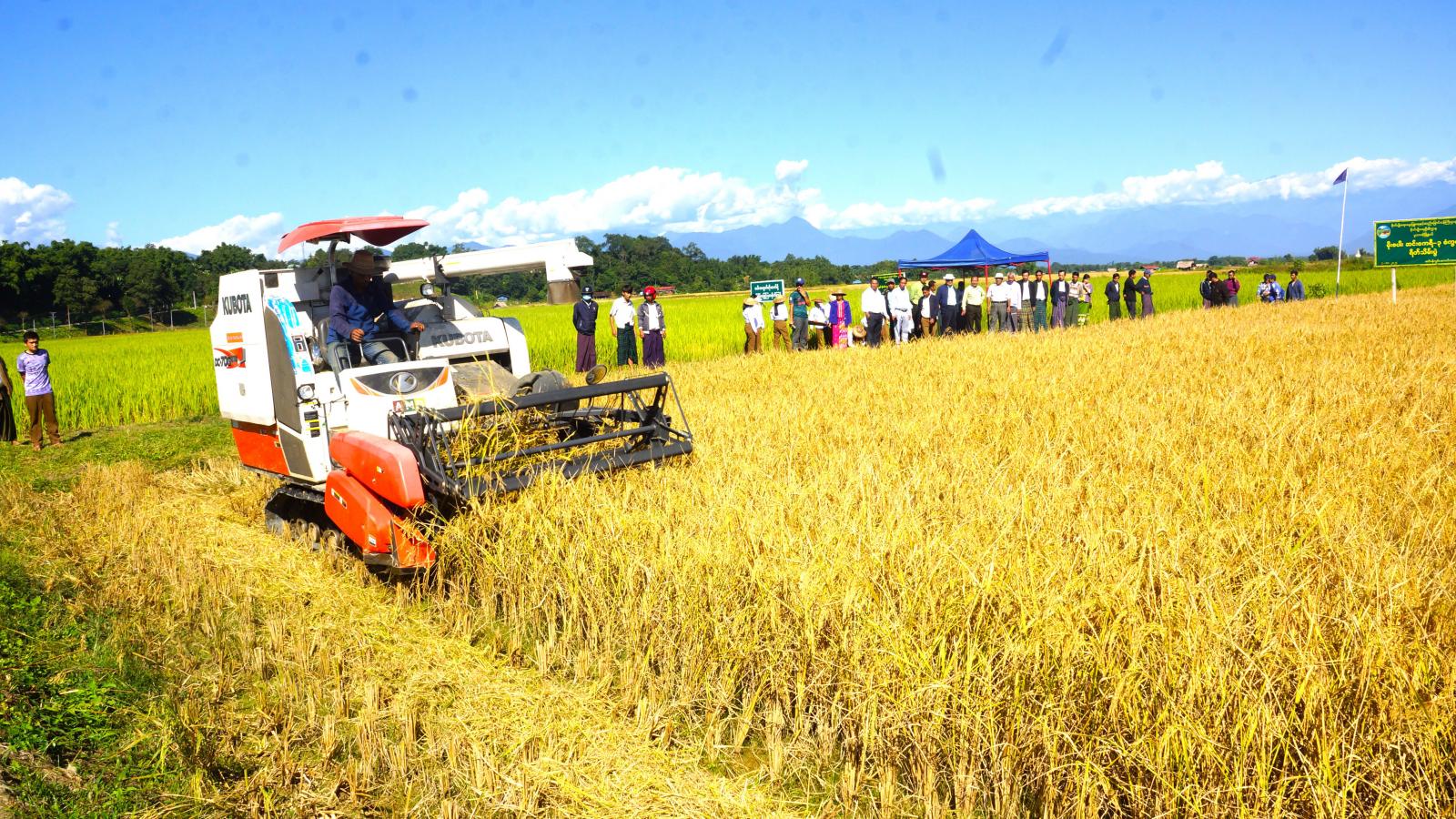 ကချင်ပြည်နယ်၊ ပူတာအိုခရိုင်တွင် ပူတာအိုဒေသဝမ်းစာဖူလုံရေးအတွက် ၂၀၂၃-ခုနှစ် မိုးစပါးဆင်းဧကရီ-၃ မျိုးစေ့ထုတ်စိုက်ခင်းအား စံကွက်ရိတ်သိမ်းခြင်းနှင့် ရိတ်သိမ်းခြွေလှေ့စက်ဖြင့် တောင်သူကွင်းသရုပ်ပြပွဲကို ယနေ့နံနက်(၉)နာရီခွဲက ပူတာအိုမြို့ ကောင်ကထောင်ရပ်ကွက်နှင့် လုံးစွတ်ရပ်ကွက်ကြားရှိ စိုက်ပျိုးရေးဦးစီးဌာန ပိုင်လယ်မြေမတ်ပန်ကွင်းတွင် မိုးစပါးအထွက်တိုးဆင်း ဧကရီ-၃မျိုး စေ့ထုတ်စိုက်ခင်း(၅)ဧက၌ကျင်းပသည်။