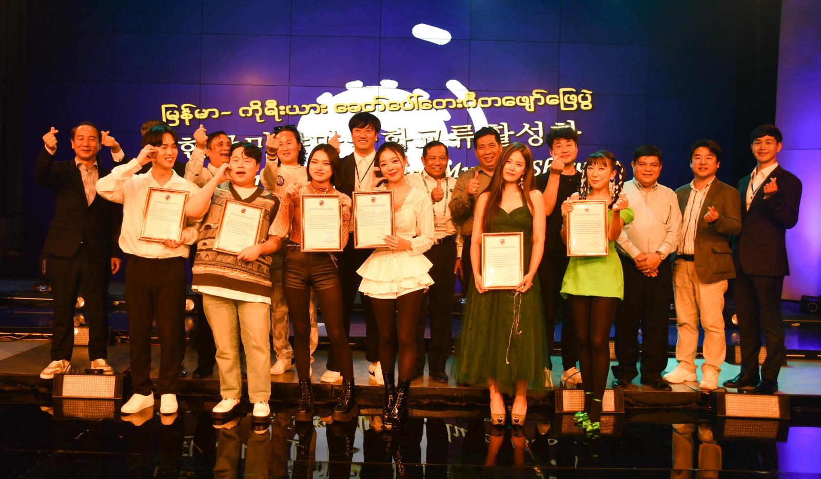 ထို့နောက် သီဆိုဖျော်ဖြေခဲ့ကြသည့် မြန်မာကိုရီးယားအနုပညာရှင်အဖွဲ့အား ပြန်ကြားရေးဝန်ကြီးဌာန ပြည်ထောင်စုဝန်ကြီး ဦးမောင်မောင်အုန်းကိုယ်စား မြန်မာ့အသံနှင့်ရုပ်မြင်သံကြား ညွှန်ကြားရေးမှူးချုပ်ဦးရဲနိုင်က ဂုဏ်ပြုပန်းခြင်းမှတ်တမ်းလွှာနှင့် အမှတ်တရလက်ဆောင်ပစ္စည်းများ ပေးအပ်ချီးမြှင့်ခဲ့ပြီး ကိုရီးယားအဖွဲ့ကလည်း အမှတ်တရ လက်ဆောင်အား ပြန်လည်ပေးအပ်သည်။