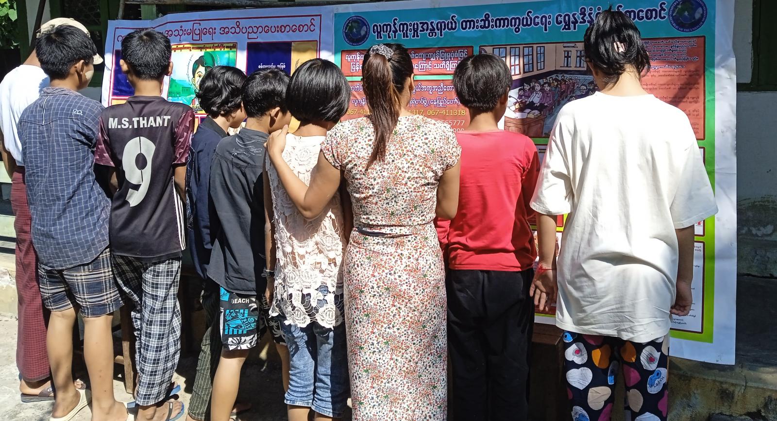 ဆက်လက်၍ လူထုအခြေပြုဗဟိုဌာန (Community Centre)ခန်းမ၌ လူကုန်ကူးမှု တားဆီး ကာကွယ်ရေး အသိပညာပေး နံရံကပ်စာစောင်နှင့် အရွယ်မရောက်သေးသူ ကလေးသူငယ်များအား စစ်မှုထမ်းစေခြင်းမှ ကာကွယ်တားဆီးထိန်းသိမ်းရေး အသိပညာပေး နံရံကပ်စာစောင်များ ခင်းကျင်း ပြသခဲ့ရာ ကျောင်းသား/သူများက စိတ်ပါဝင်စားစွာ ကြည့်ရှုလေ့လာခဲ့ကြကြောင်း သိရသည်။