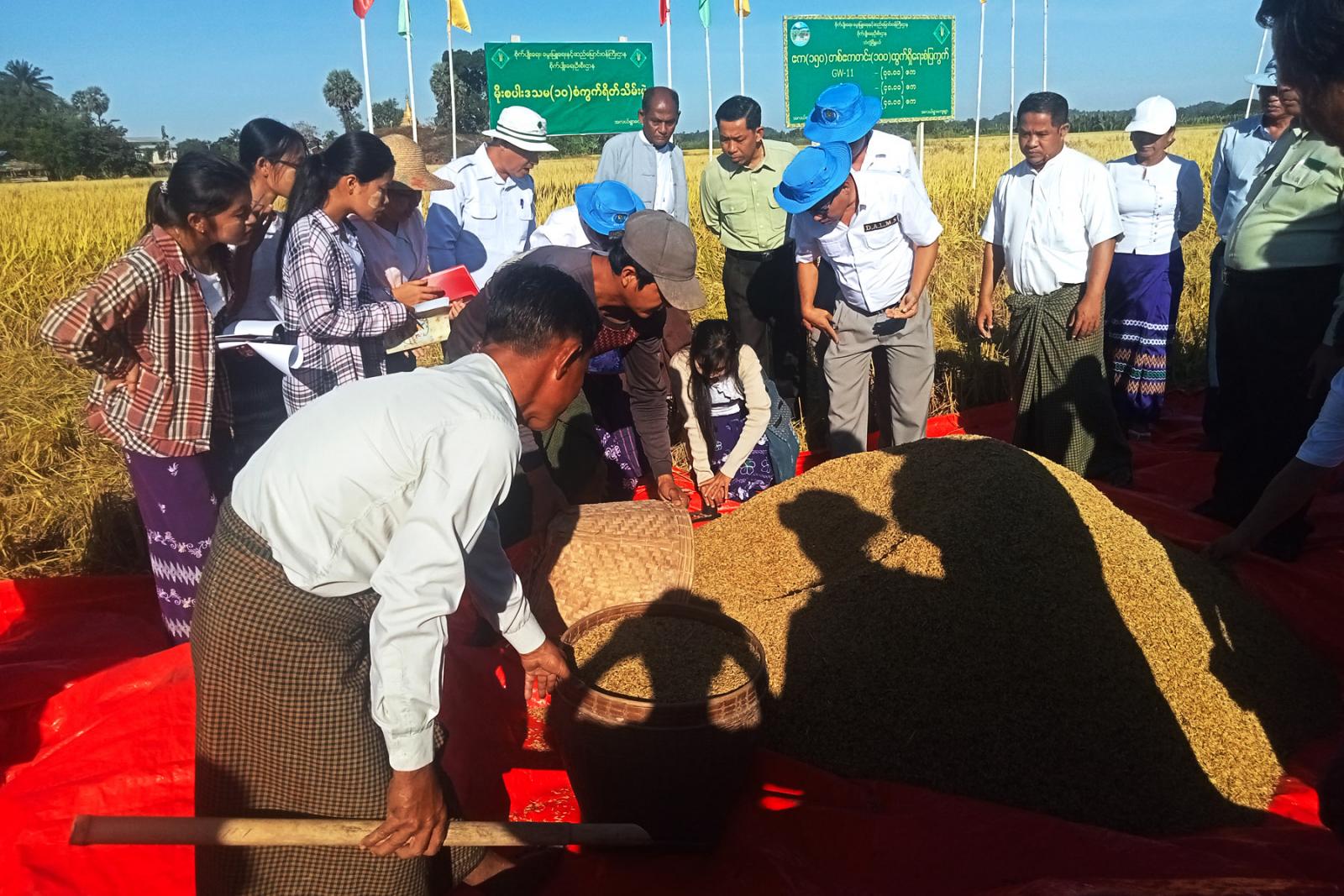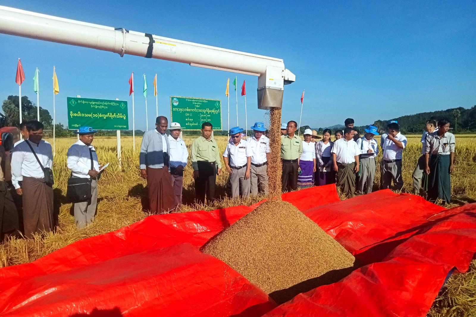 ရခိုင်ပြည်နယ်၊ သံတွဲမြို့နယ် စိုက်ပျိုးရေးဦးစီးဌာနနှင့် မြို့နယ်လယ်ယာမြေစီမံခန့်ခွဲရေးနှင့် စာရင်းအင်းဦးစီးဌာနတို့ ပူးပေါင်း၍ ယမန်နေ့ နံနက် ၉ နာရီက သံတွဲမြို့နယ် အလယ်ရွာကျေးရွာ ကွင်းအမှတ် (၁၄၆)ရှိ တောင်သူ ဦးကျော်မင်းလွှင်၏ ဧက(၁၅၀) တစ်ဧက တင်း (၁၀၀) GW-11 မိုးစပါးစိုက်ခင်း (၀.၁၀) ဧကကို ရိတ်သိမ်းရာ အစိုအထွက် (၁၅၇.၅၀)တင်း ထွက်ရှိပြီး၊ အခြောက် (၁၃၈.၀၀)တင်း ထွက်ရှိခဲ့ကြောင်း သံတွဲမြို့နယ် စိုက်ပျိုးရေးဦးစီးဌာန၊ ဦးစီးအရာရှိ ဦးဇော်ထွန်းခိုင်ထံမှ သိရသည်။