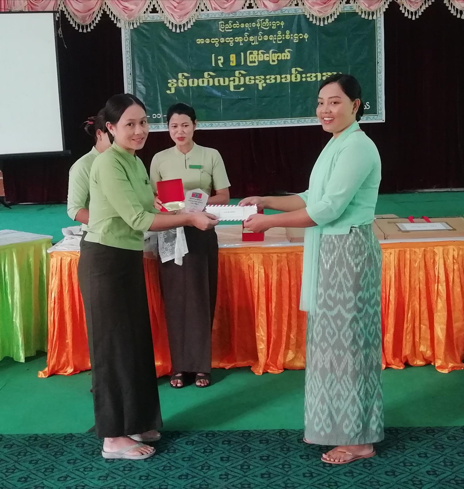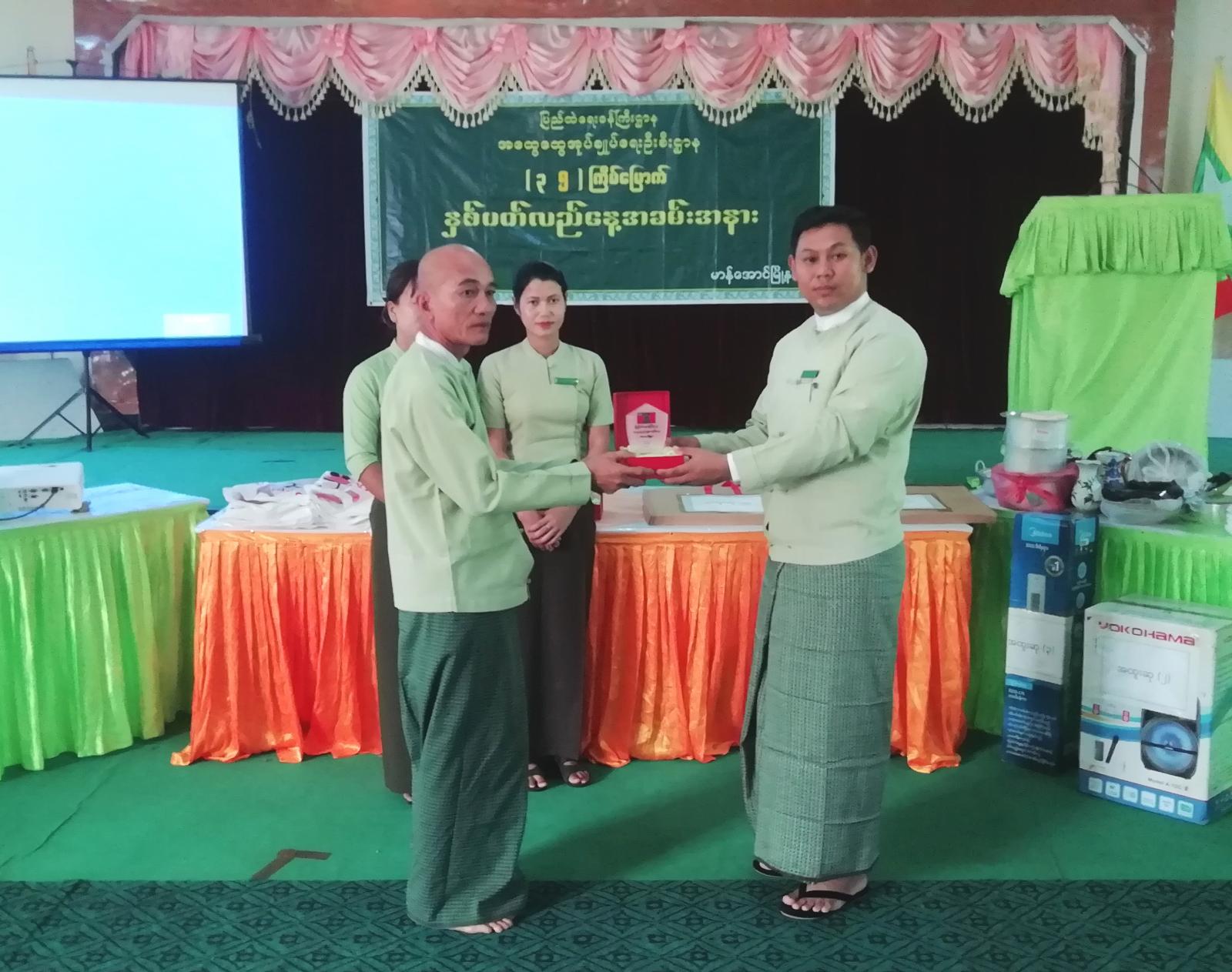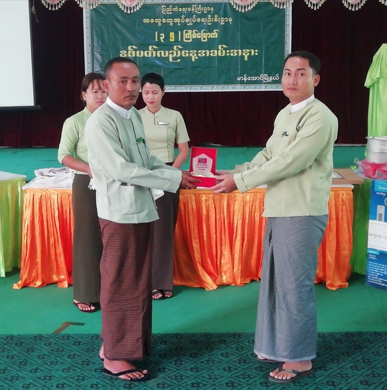 ထို့နောက် မြို့နယ်အထွေထွေအုပ်ချုပ်ရေးဦးစီးဌာနတွင် တာဝန်ထမ်းဆောင်နေသော ဝန်ထမ်းများထဲမှ တစ်နှစ်တာအတွင်း လုပ်ငန်းတာဝန်များ ထမ်းဆောင်ရာတွင် စံပြဆု ရရှိခဲ့သော ဝန်ထမ်းများအား မြို့နယ်အုပ်ချုပ်ရေးမှူးနှင့် တာဝန်ရှိသူများက ဆုများ အသီးသီးချီးမြှင့်ကြသည်။